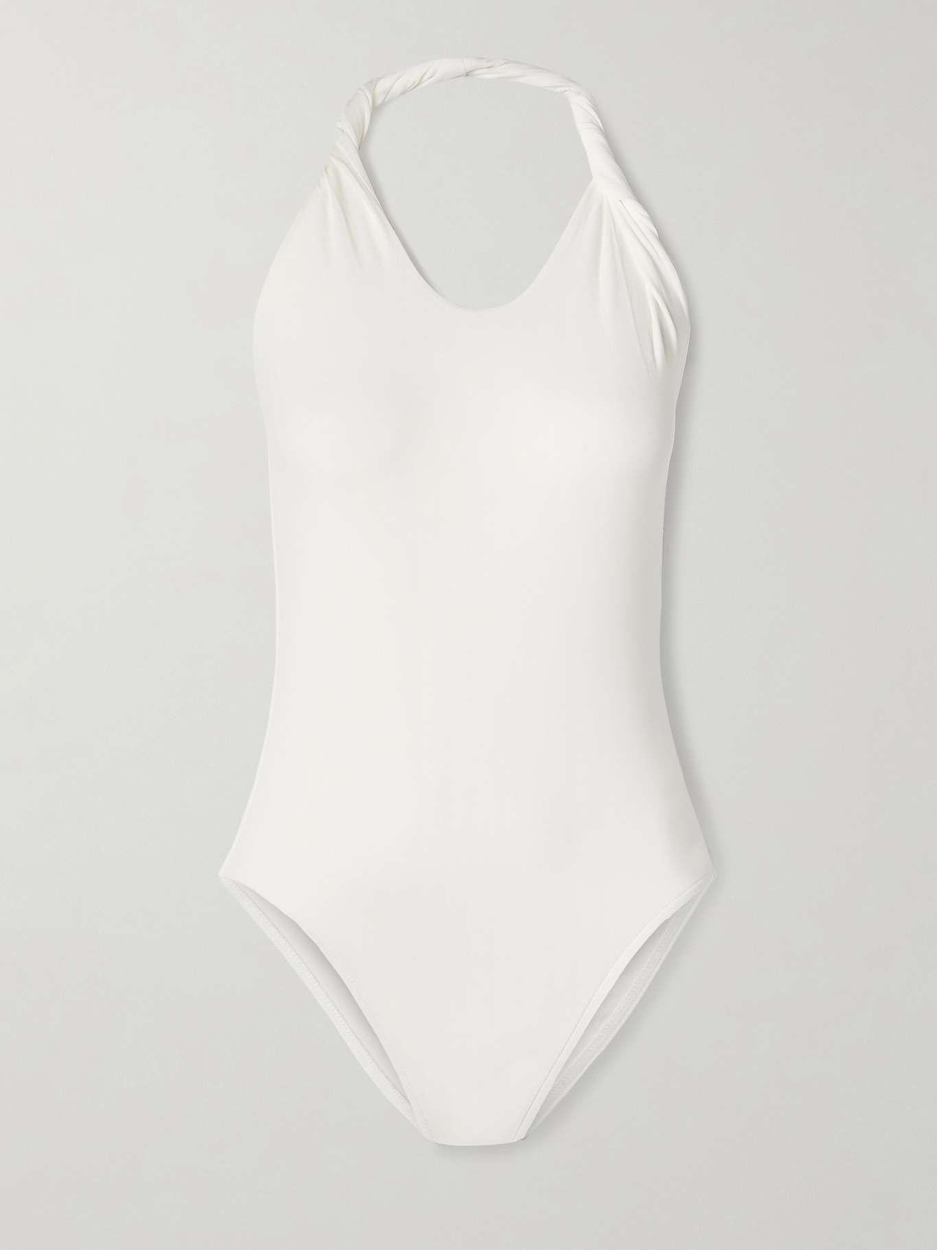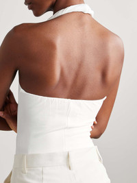 TOVE's 'Enya' bodysuit is made from Italian stretch-jersey, which closely hugs your frame to create a smooth base layer. It has a hand-twisted halterneck strap for textural interest and looks just as chic styled with jeans or a mini skirt. Size & Fit - Fits true to size, take your normal size - Those with a long torso may wish to take the next size up - Designed for a very close fit - Full brief coverage - Mid-weight, stretchy fabric - Model is 175cm/ 5'9" and is wearing a FR 36 Model measurements: - Bust: 75cm/ 29.5" - Waist: 60cm/ 23.5" - Hip: 93cm/ 36.5" Details & Care - Ivory stretch-jersey - Concealed snap fastenings at base - 92% viscose, 8% elastane - Hand wash or dry clean