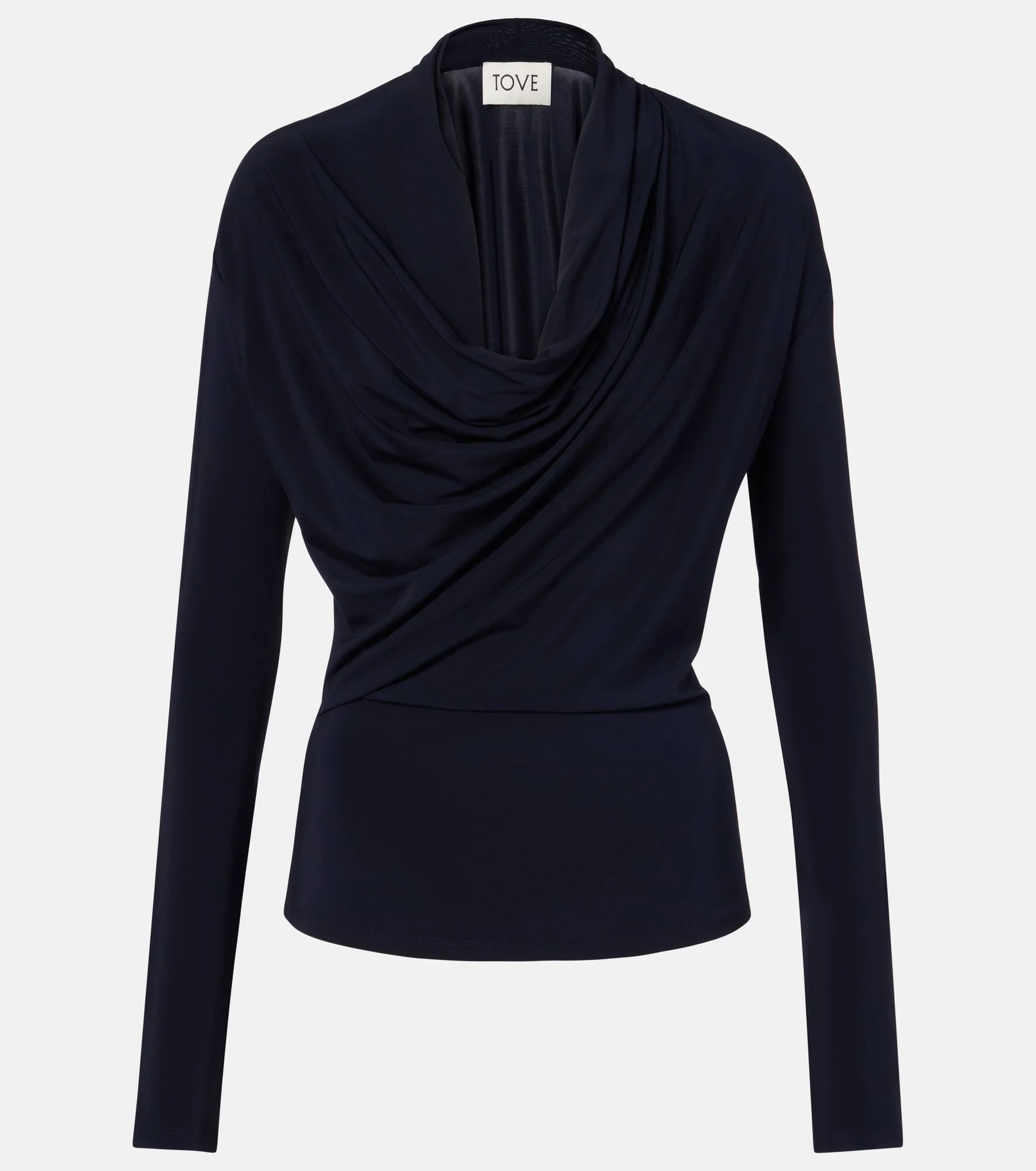 Tove's draped jersey pieces are a signature style, known for their fluid lines and understated elegance. The Fina top has a cowl neckline and slim, long sleeves. Product Details - Material: 95% viscose, 5% elastane - Care instructions: machine wash at 30 degrees - Made in Portugal - Designer color name: Navy - Item color: blue - Item number: P01070908 Size & Fit - True to size - Cinched waist - Stretchy fabric - Falls to the hip - The model seen in the picture is 178cm-5'10" and wearing a size FR 36