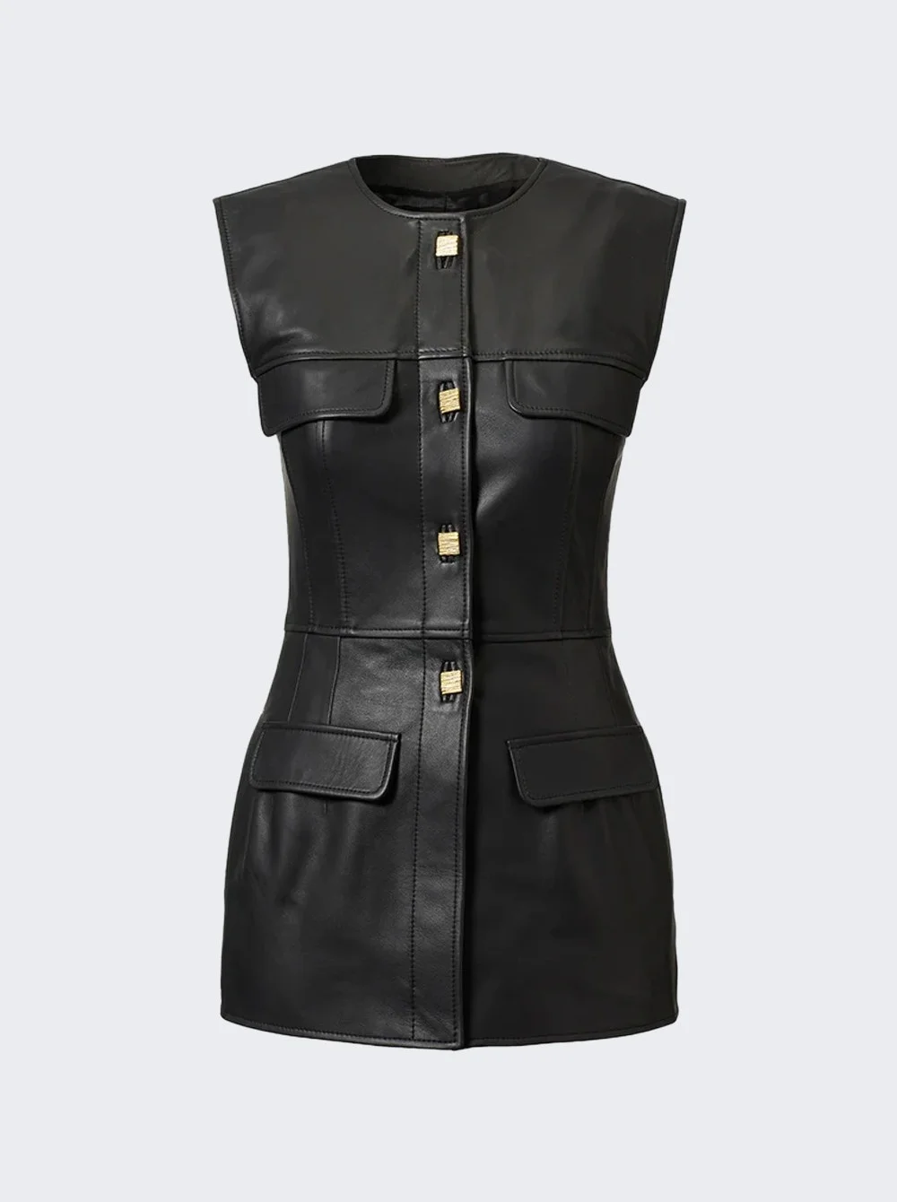 Details - Crafted from luxurious soft Nappa leather - Impeccably tailored for a clean silhouette - Sleeveless and accented with signature organic textured gold button - Model is 5'9"/175cm and is wearing a size FR36 - 100% Nappa Leather Brand Style: TVQ009BLK Designer/Brand: TOVE