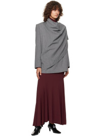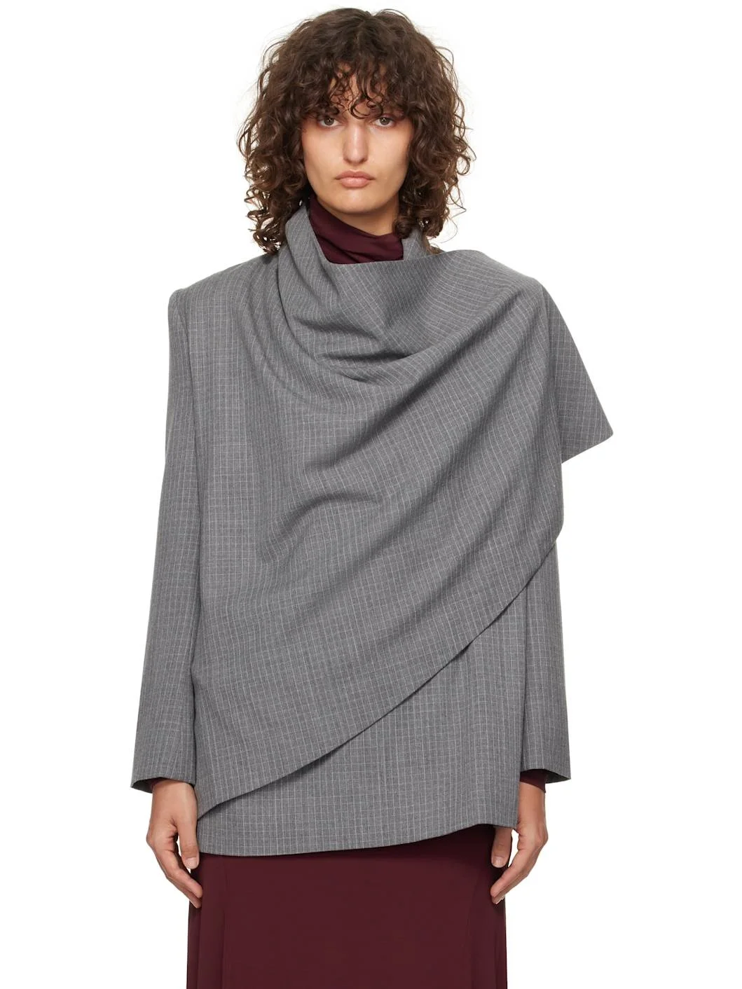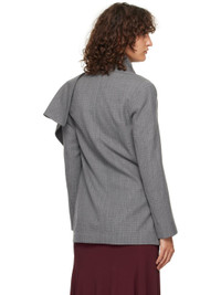 Virgin wool twill jacket. Self-tie fastening at front and interior side seam for alternate styling. · Check pattern throughout · Wrap construction · Shawl lapel · Open front · Padded shoulders · Partial satin lining Supplier color: Grey