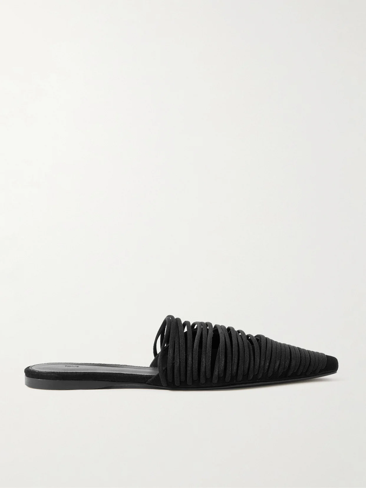 TOVE emphasizes subtle details and high-quality materials throughout its collections, and the latest footwear is no exception. These 'Kenly' mules are made from velvety suede and have tonal cord trims that wrap around the pointed toes.