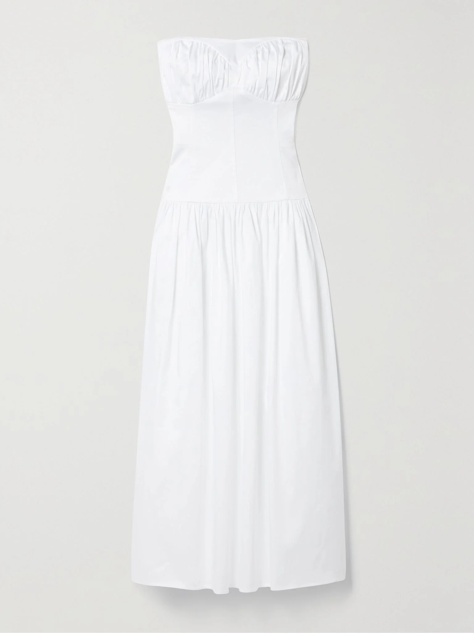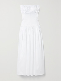 TOVE's 'Lauryn' dress has gathered cups and a fitted, corset-inspired bodice that cinches the waist. It's cut from white cotton-blend and falls to a flowy midi skirt. Style yours with mules or slides, depending on the occasion. Details & Care - White stretch-cotton - Concealed zip fastening along back - 97% cotton, 3% elastane - Dry clean