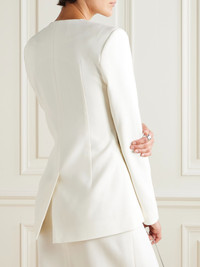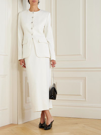 TOVE's 'Moya' jacket reimagines '80s power dressing for today. Tailored from wool-twill, it has a collarless shape with padded shoulders and engraved silver-tone buttons that lead to a split hem. We think it looks best paired with the matching 'Jeanette' skirt in our edit. Size & Fit - Fits true to size, take your normal size - Those with broad shoulders may wish to take the next size up - Designed for a slim fit - Mid-weight, non-stretchy fabric - Model is 177cm/ 5'10" and is wearing a FR 36 Model measurements: - Bust: 85cm/ 33.5" - Waist: 62cm/ 24.5" - Hip: 91cm/ 36" Details & Care - White wool-twill - Button fastenings through front - 100% wool; lining: 100% viscose - Fully lined - Dry clean