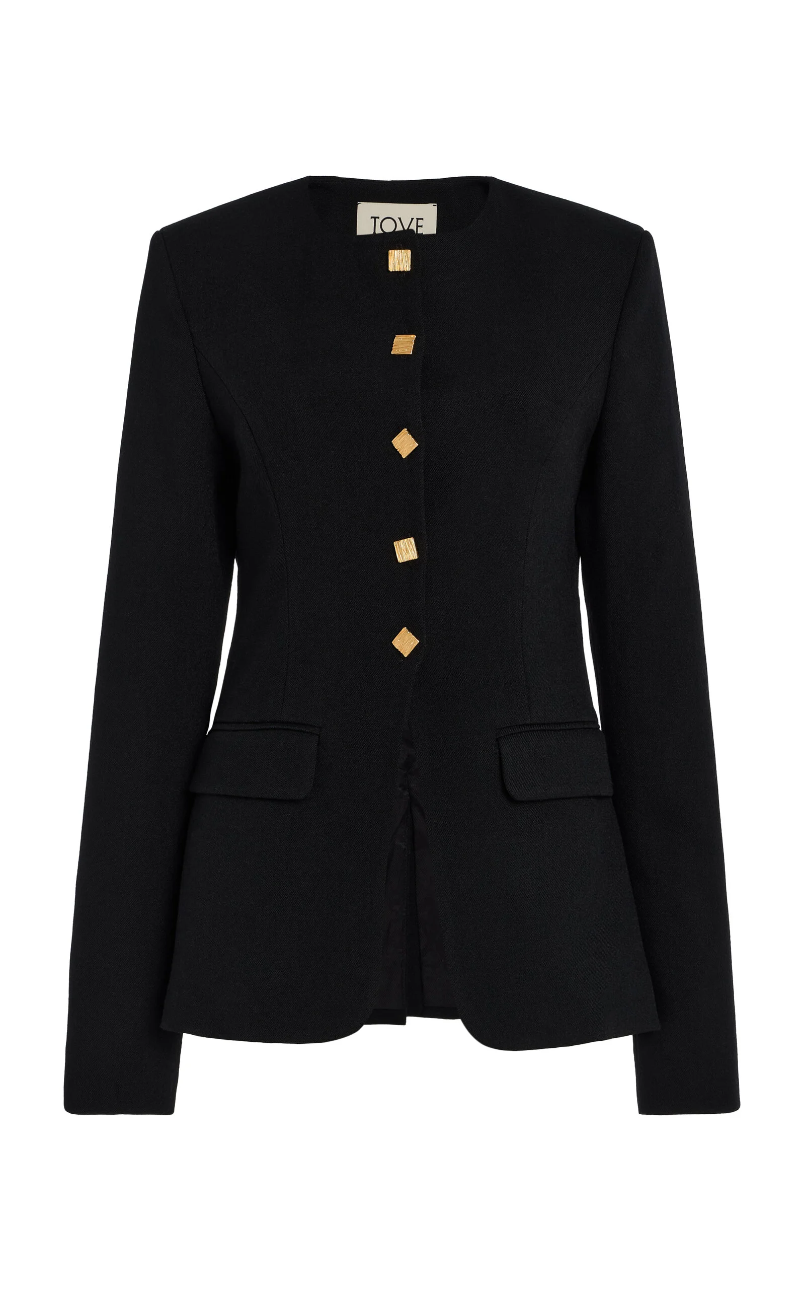 Expertly crafted with luxury fabrics, every Tove collection is thoughtfully made to last through seasons and styles. Co-founders Camille Perry and Holly Wright design classics for the modern woman, and this collection promises clean lines and feminine silhouettes. Tailored from suiting wool, the 'Moya' collarless jacket has a slim silhouette with lightly padded shoulders and engraved gold buttons along the front before it splits at the hem. PRODUCT DETAILS - Pre-Fall '25 - Button fastening - Composition: 100% virgin wool - Dry clean - Made in Portugal