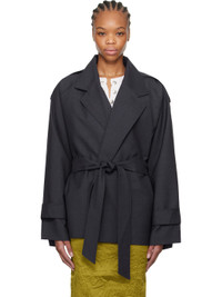 Virgin wool twill jacket. · Notched lapel · Open front · Belt loops and self-tie belt · Epaulets · Raglan sleeves · Belt loops and fixed tab at cuffs · Storm flap at back · Partial satin lining Supplier color: Navy Body: 100% virgin wool. Lining: 100% viscose. Made in United Kingdom 251933F063000