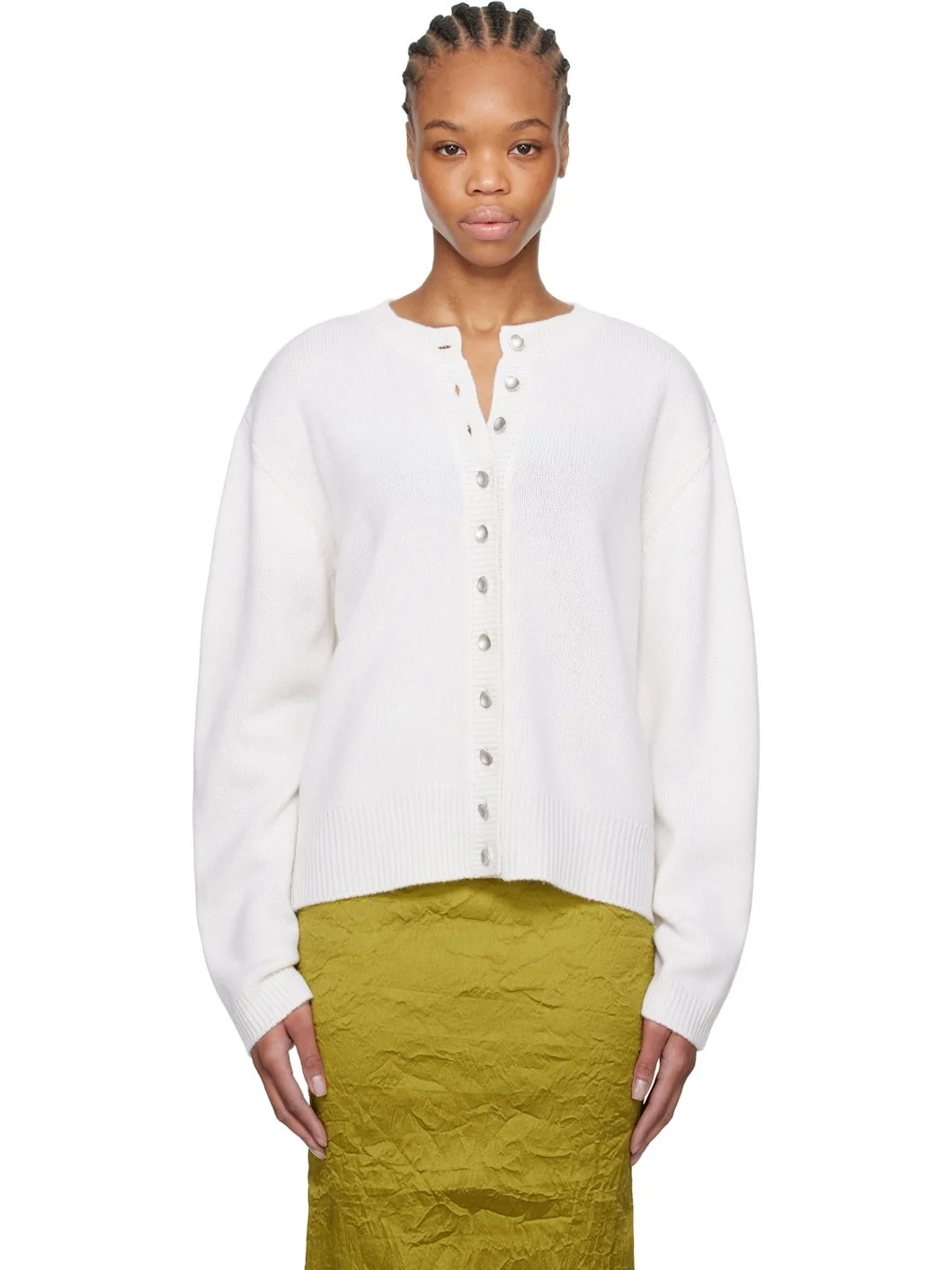 Knit cashmere cardigan. · Rib-knit crewneck, hem, and cuffs · Button closure · Silver-tone hardware Supplier color: Soft white 100% cashmere. Made in Mauritius 251933F095000