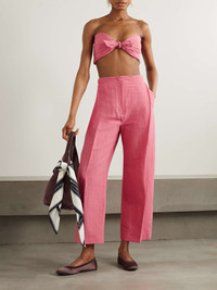 EDITORS'NOTES EXCLUSIVE AT NET-A-PORTER. TOVE's 'Santu' pants are made from linen-blend with plenty of cotton for added softness. Designed to sit high on the waist, they have pleats that trace from the hips to the front of the wide legs. The 'Dusty Cherry' will go nicely with muted neutrals and pops of yellow. SIZE & FIT Model measurements: - Fits true to size, however those who are between sizes should take the larger size - High-rise, cut for a wide-leg fit - Lightweight, non-stretchy fabric - Model is 180cm/ 5'11" and is wearing a FR 36 - Bust: 80cm/ 31.5" - Waist: 65cm/ 25.5" - Hip: 89cm/ 35" DETAILS & CARE - Pink linen-blend - Concealed button, hooks and zip fastening at front - 58% linen, 37% cotton, 5% elastane - Designer color: Dusty Cherry