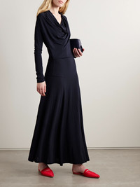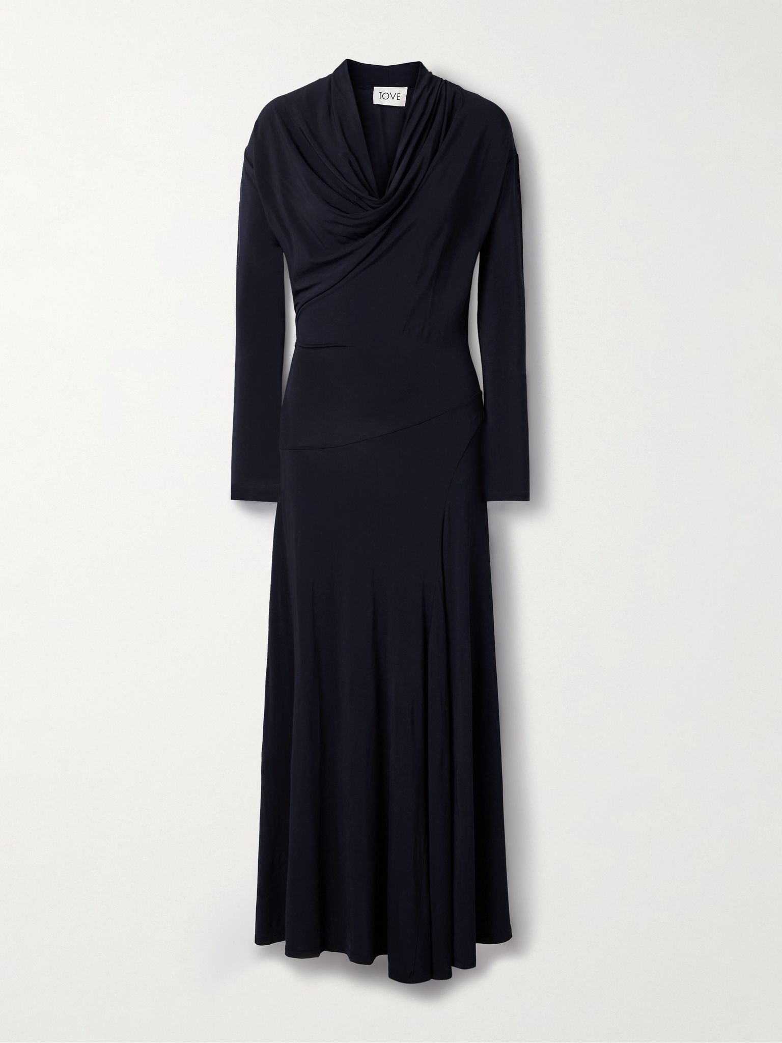 TOVE's 'Eadan' dress is draped throughout, accentuating your curves so nicely. It's made from slinky jersey for a close fit and has a flowy hem. Wear yours with metallic sandals and minimal jewelry. Size & Fit - Fits true to size, take your normal size - Designed to be slightly fitted at the bust and waist, loose at the hip - Mid-weight, stretchy fabric - Model is 180cm/ 5’11” and is wearing a FR 36 Model measurements: - Bust: 77cm/ 30.25" - Waist: 61cm/ 24" - Hip: 89cm/ 35" Details & Care - Navy jersey - Slips on - 95% viscose, 5% elastane - Unlined - Machine wash