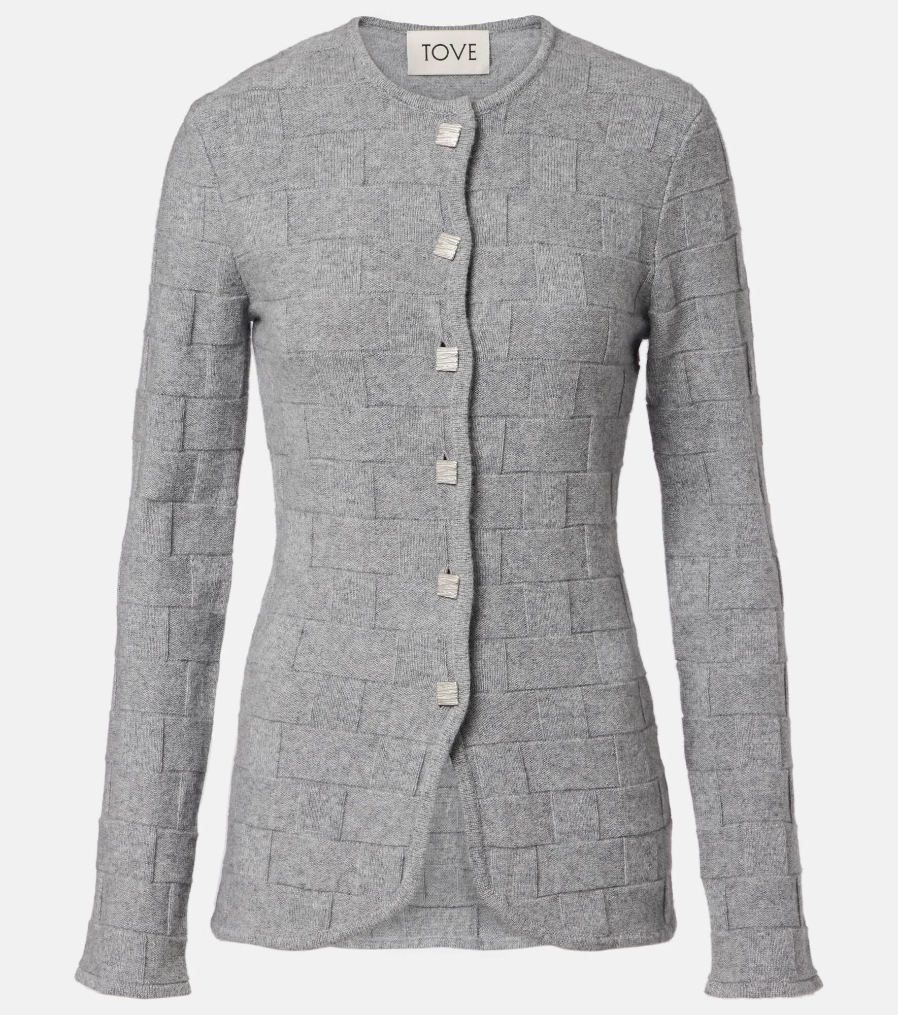 The Uma cardigan from Tove is a timeless and versatile piece for your wardrobe. Knitted from pure cashmere, the design features a textural basket-weave surface and has a fitted silhouette. Product Details - Material: 100% cashmere - Care instructions: hand wash - Made in the UK - Color: grey - Designer color name: Grey - Hardware color: silver - Closure: buttoned front - Item number: P01123839 Size & Fit - True to size - Fitted - Stretchy fabric - Falls below the hip - The model seen in the picture is 178cm-5'10" and wearing a size XS