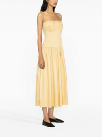 Lauryn strapless midi dress Gathered detailing is the undisputed star of Tove's recent collections, and it elevates the simple silhouette of this yellow strapless dress. Soft folds enhance the bralette-like panel at the bust and add volume and dimension to the mid-length skirt. Highlights - Light yellow - Stretch-cotton - Empire line - Strapless - Gathered detailing - Flared skirt - Mid-length Imported Composition Organic Cotton 100% SIZE & FIT Model measurements Height 5 ft 10 in(1.78 m) Bust/Chest 31.49 in(80 cm) Hips 35.03 in(89 cm) Waist 23.62 in(60 cm) FittingInformation Designed for a close fit at the chest and waist with a loose fit at the hip Made from a midweight non-stretch fabric, this piece offers minimal elasticity when worn This piece fits true to size – take your usual size Washing instructions Machine Wash