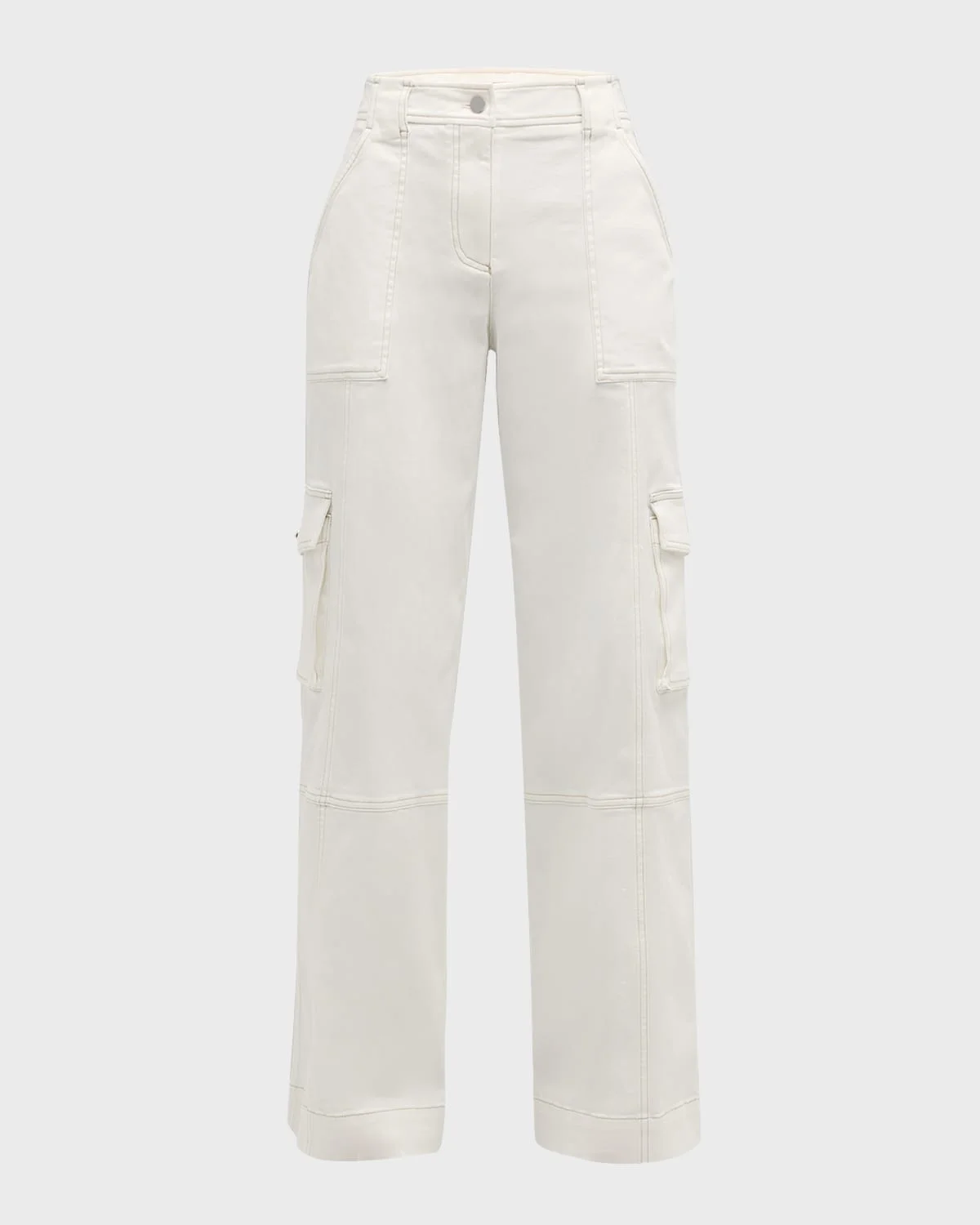 TWP "Coop" stretch cotton twill pants detailed with contrast stitching Approx. measurements: 31.9" inseam; 41.8" outseam Mid rise sits high on hip Side patch pockets; cargo leg pockets Wide legs Full length Button/zip fly; belt loops Cotton Dry clean only Made in USA from imported materials