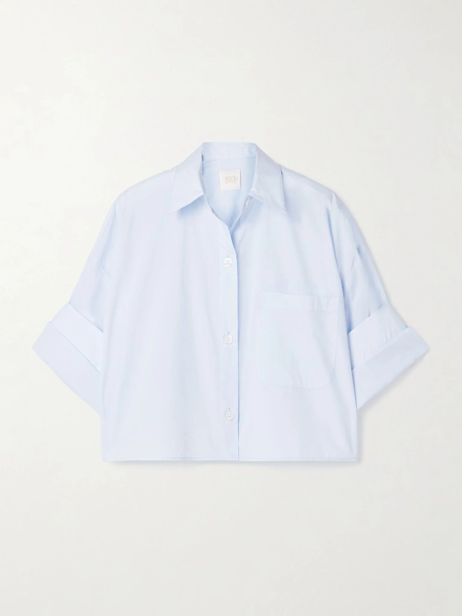 Often inspired by menswear, TWP's 'Next Ex' shirt is a fresh take on classic shirting. It's made from crisp cotton-poplin and has double-cuffed sleeves and a single chest pocket. Complement the cropped length with high-waisted jeans. Size & Fit - Fits true to size, take your normal size - Designed for a relaxed fit - Lightweight, non-stretchy fabric - Model is 175cm/ 5'9" and is wearing a size XS/S Model measurements: - Bust: 74cm/ 29" - Waist: 61cm/ 24" - Hip: 89cm/ 35" Details & Care - Light-blue cotton-poplin - Button fastenings through front - 100% cotton