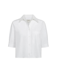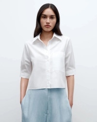 The Short Lived Shirt in White by TWP Clothing is a cropped, half sleeve button down featuring a chest patch pocket, pleats at the sleeves, french cuffs, and an exposed button placket at the back. - 100% Cotton - Boxy fit - #A555359-W443