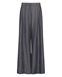 The Avery Pant in Sequined Denim by TWP Clothing is a mid-rise, wide leg pleated pant featuring side pockets, back welt pockets, and belt loops crafted in a denim-look blend with a sequin yarn. - Material: 40% Cotton, 38% Polyester, 26% Linen, 6% Viscose - Details: Concealed zip, and hook and bar closure - Pair back to the matching Ex T Top - Fit: Relaxed through the hip and leg.