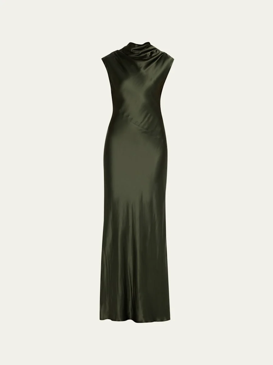 Cut from lightweight viscose satin with a silky liquid finish, the "Back to You" dress by TWP features a biascut silhouette with a lowcut open back Approx. 64.4"L from shoulder to hem High cowl neckline Sleeveless Full length Column silhouette Back selfties Concealed side zipper Viscose/elastane Made in USA from imported materials