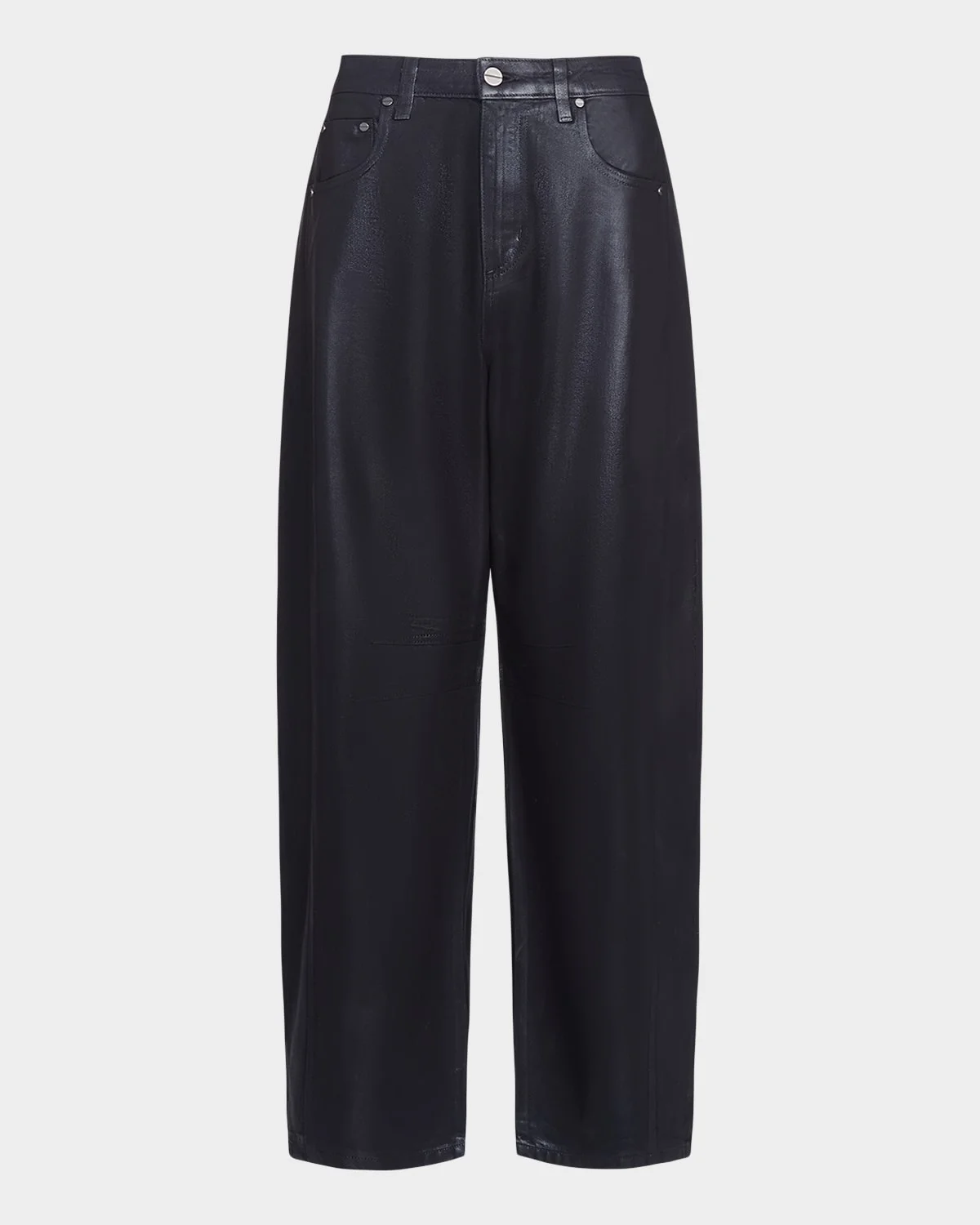 Crafted from nonstretch, coated black denim, TWP's "Beryl" jeans feature a barrelleg silhouette detailed with nailhead rivets Midrise Fivepocket style Darts at the knee Full length Wide legs Button/zip fly; belt loops Polyethylene terephthalate (pet)/cotton/polyurethane Dry clean Made in USA