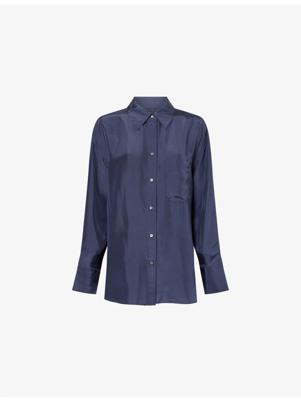 PRODUCT DETAILS - TWP silk shirt - 100% silk - Exposed button fastenings at front - Oversized fit, pointed collar, dropped shoulders, long sleeves, French buttoned cuffs, one chest patch pocket, tulip hem - Dry clean only - True to size - Size small: length 29.5in / 75cm - Model is 5ft 10in/1.78m and wears a size small - Lightweight, non-stretch Ref: R04588204