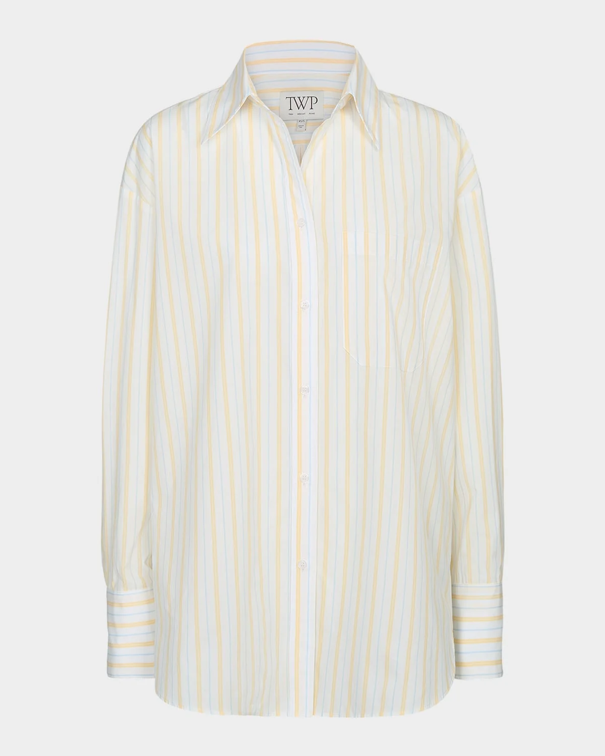 A menswear-inspired silhouette, the "Big Joe" shirt by & nbsp;TWP is cut from signature lightweight & nbsp;cotton poplin in a classic striped design & nbsp; Approx. 29.8"L from shoulder to hem Spread collar; button front Dropped shoulders Long sleeves; button cuffs Chest patch pocket Yoked back Hip length Relaxed fit Shirttail hem Cotton Dry clean Made in USA SIZE & FITModel measurements: 5 & apos;10" tallModel is wearing a US size 4/Small