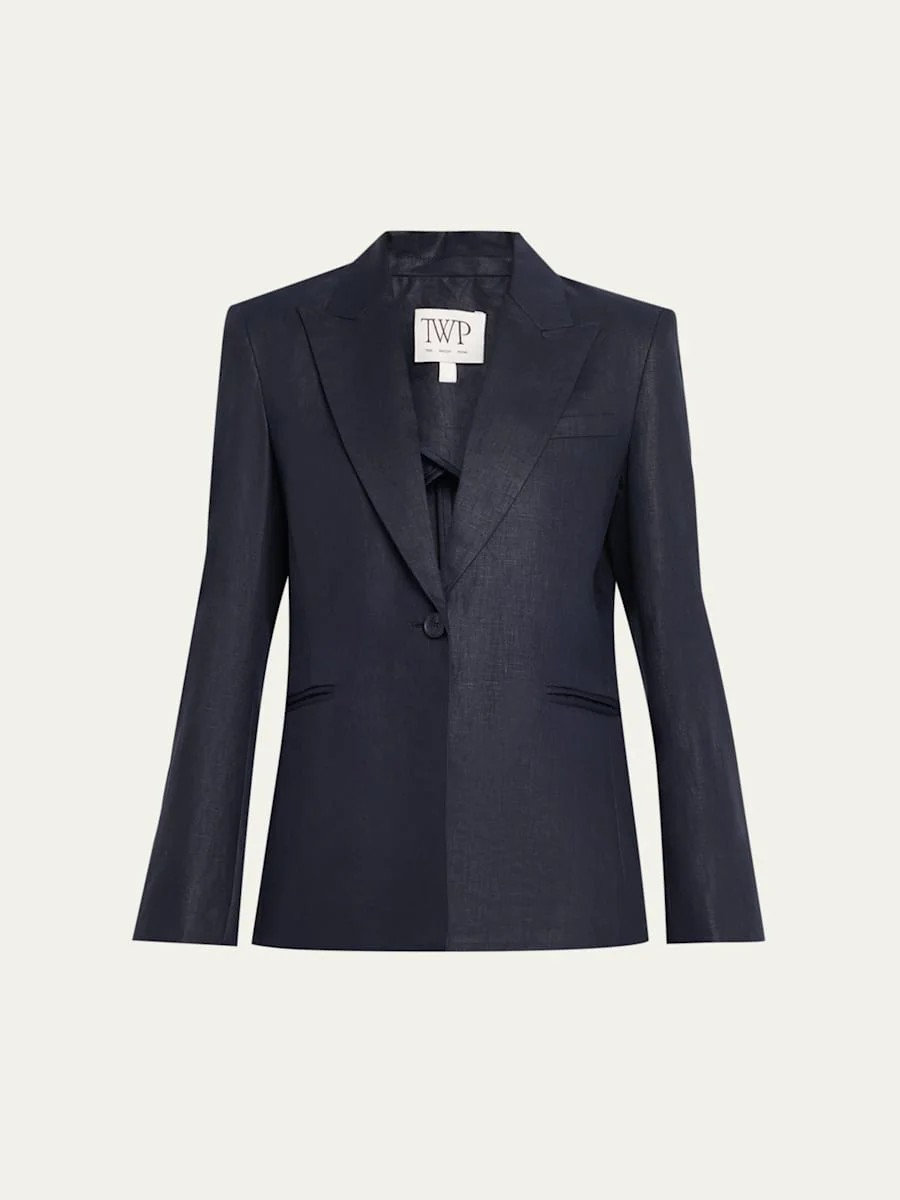 TWP's "Boy" blazer is realized in a classic, compact linen with a chintzed finish for structure and a subtle, luxe sheen Peak lapels; singlebutton front Custommolded shoulder pads Long sleeves; button cuffs Chest welt pocket Side pockets Vented back hem Oversized fit Linen Dry clean Made in USA SIZE amp; FITModel measurements: 5'10" tall Model is wearing a US size 4/Small