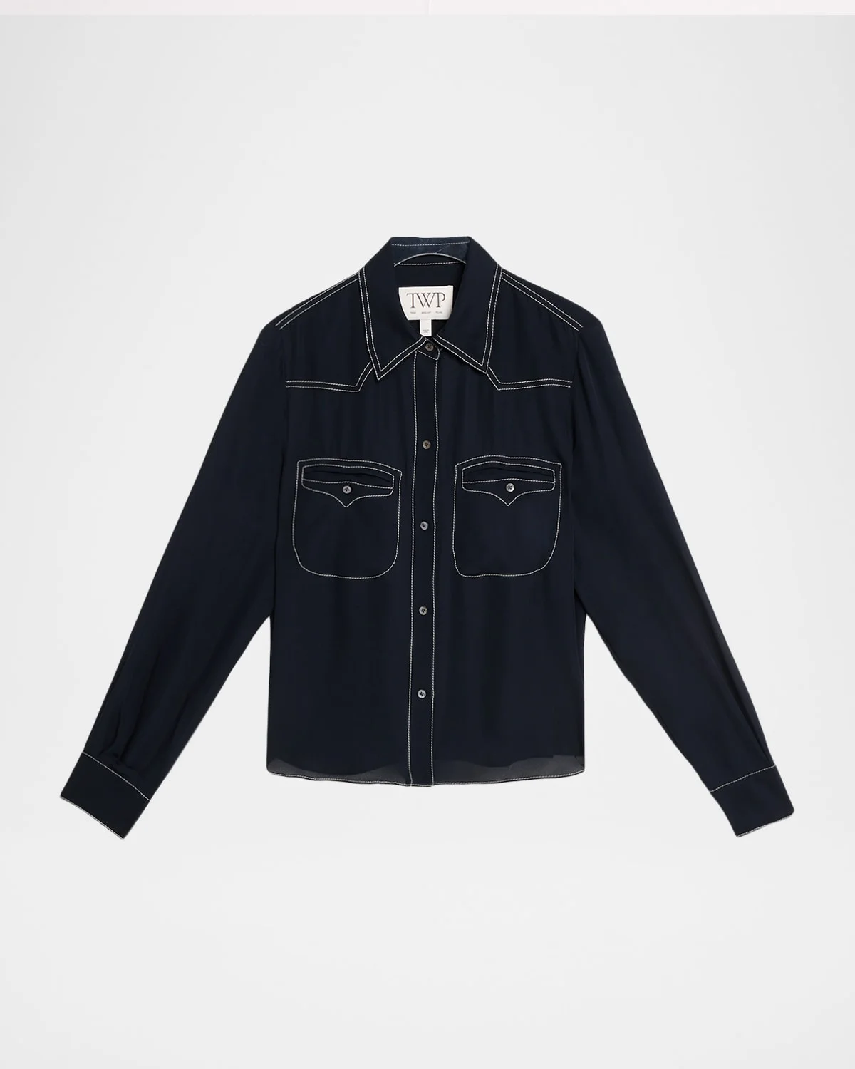 Cut from mediumweight stretch silk georgette with a smooth, drapey hand, the "Carter" shirt by TWP is finished with contrast stitching Spread collar; button front Long sleeves; button cuffs Chest flap pockets Exposed front and back yokes Boxy fit Hip length Silk Dry clean Imported