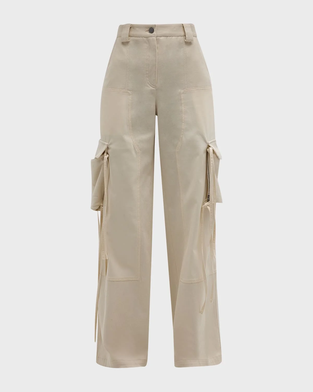 TWP "Cody" utility pants outfitted with strappy cargo pockets Approx. measurements: 10.5" rise; 32" inseam; 42" outseam Mid rise sits high on hip SIde inset pockets; back patch pockets Relaxed fit Wide legs Full length Button/zip closure Cotton Dry clean Made in USA from imported materials