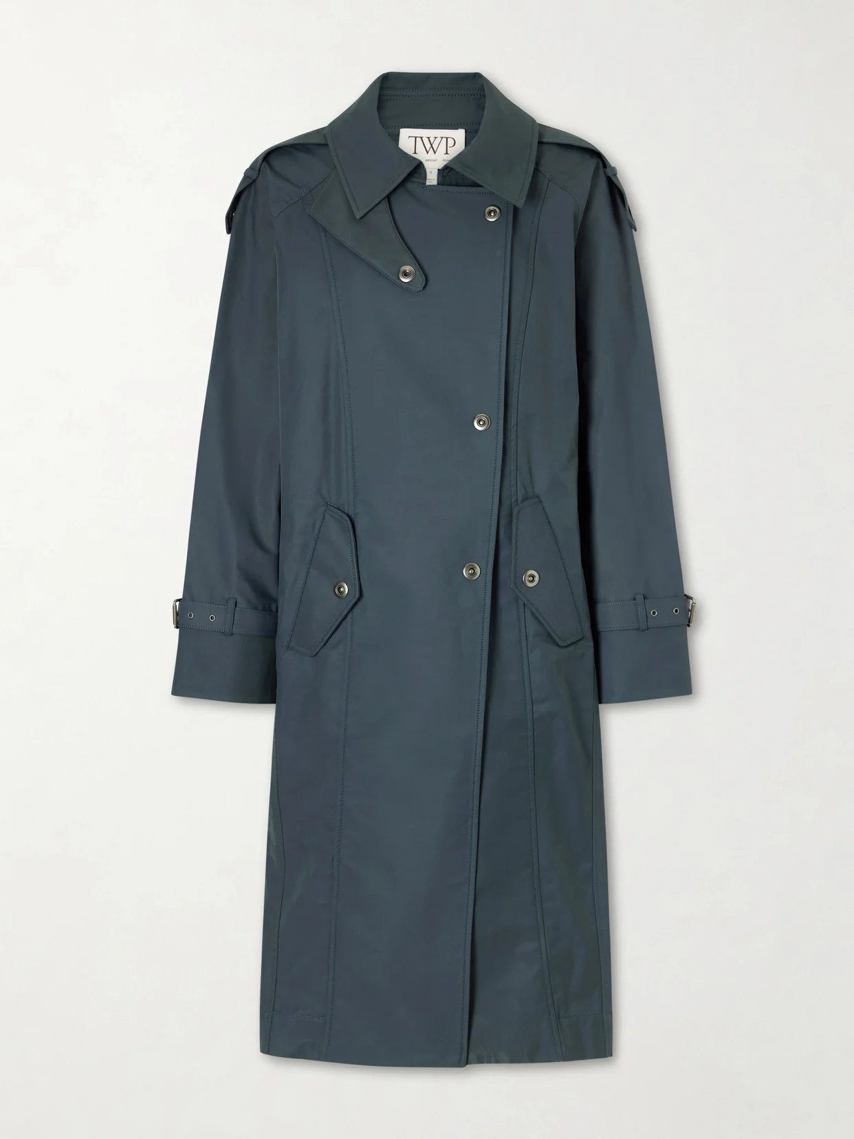 TWP's trench coat is crafted in the USA from waterproof cotton-blend canvas. It's cut in a clean silhouette with a point collar and classic storm flap, while adjustable cuffs enhance its utilitarian feel, designed to keep you dry when the weather turns.