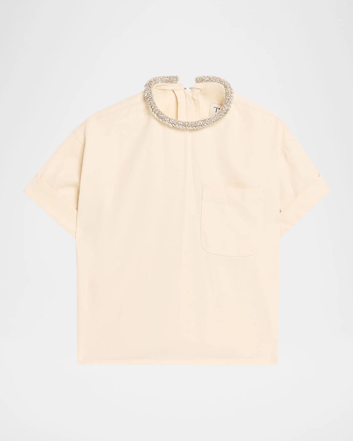 The "Ex T" top by TWP is embellished with a prongset crystal collar Mock neckline Cuffed short sleeves Single chest patch pocket Boxy silhouette Cropped length Center back zipper Cotton Dry clean Imported