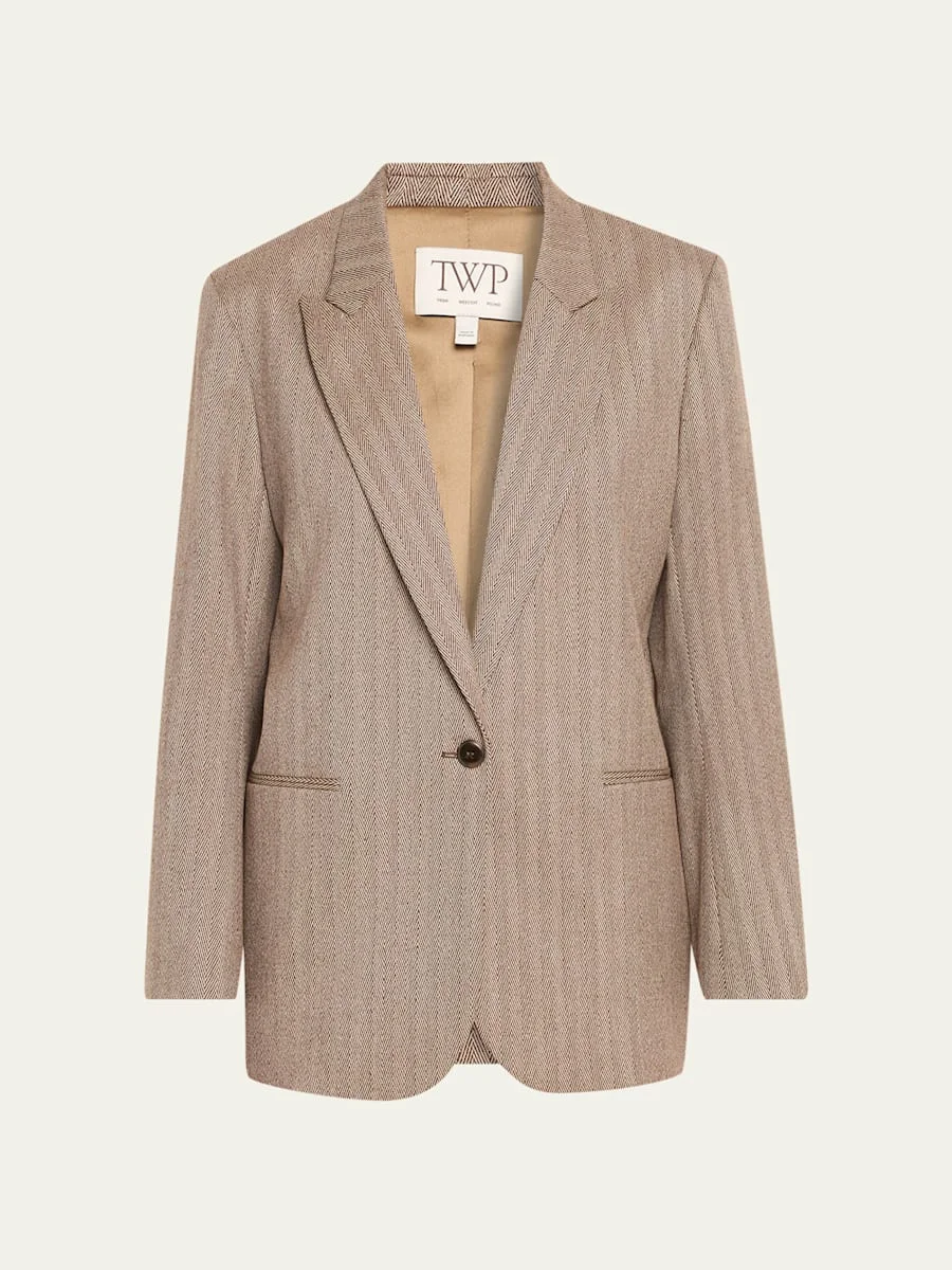 TWP "Girl Boy Girl" classic tailored blazer constructed of wool suiting in a chevron pattern, complete with padded shoulders Approx. 29"L from shoulder to hem Peak lapels; single-button front Long sleeves; button cuffs Hip besom pockets Oversized fit Mid-length Linen Made in Portugal Online Inquiries: BGS21_T6Y9X| Store Inquiries: #5065418