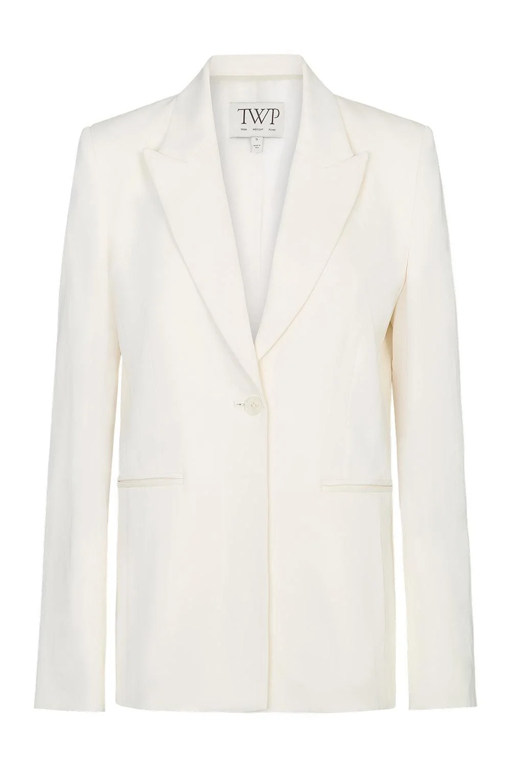 DETAILS AND INSIGHT Twp her fit blazer in bone. Pre-Order Ships By April 21 76% Viscose, 24% Linen Dry Clean Made In Us Style 16201-W185-BON