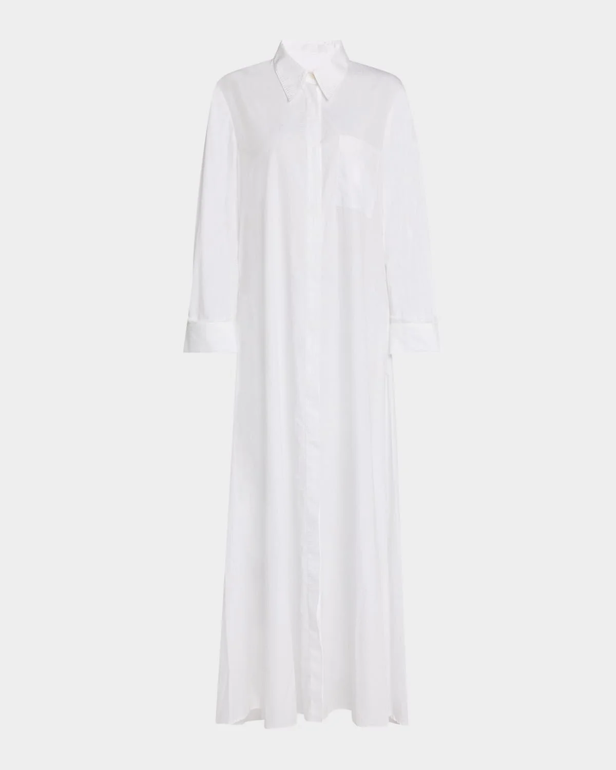 TWP "Jennys" crystalembellished stretch poplin shirtdress Approx. 56"L from shoulder to hem Spread collar; concealed button front Long sleeves; singleroll button cuffs Single chest patch pocket Side seam pockets Boxpleated back yoke Full length Aline silhouette Cotton Made in USA from imported materials
