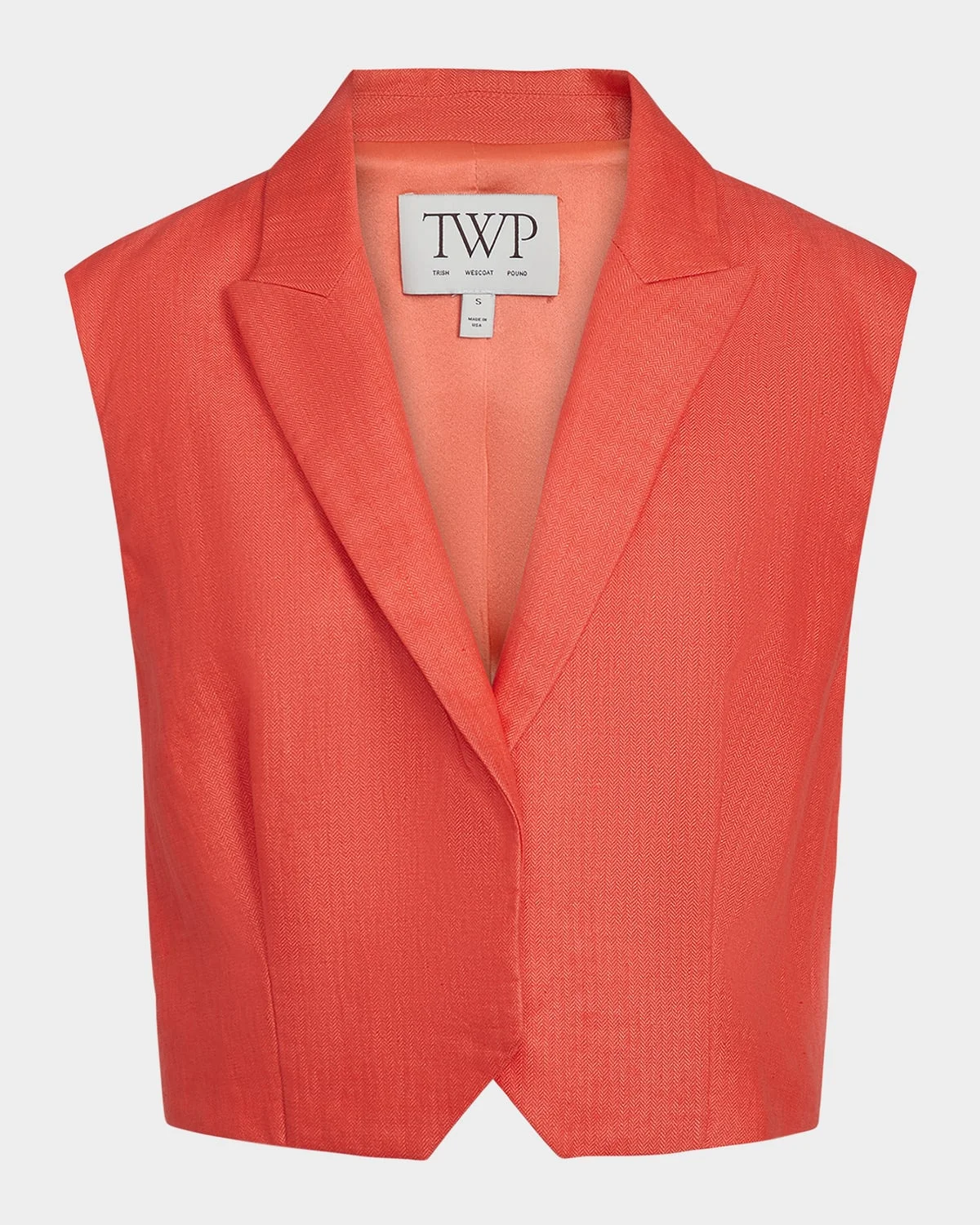 - TWP "Katie" tailored vest - Approx. 19"L from shoulder to hem - Peak lapels - Padded shoulders - Sleeveless - Classic fit - Hip length - Concealed button front - Cotton/linen - Dry clean - Made in USA from imported materials