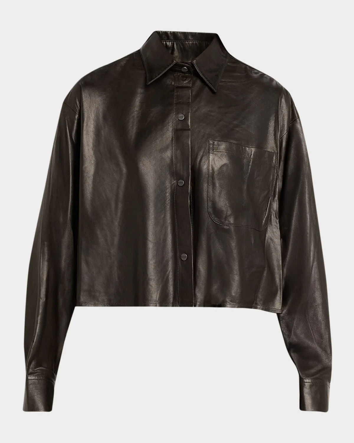 Crafted from smooth lambskin leather, TWP & apos;s "Little Big Joe" shirt is finished with silver-tone hardware Approx. 21"L from shoulder to hem Point collar; button front Dropped shoulders Long sleeves; button cuffs Single chest patch pocket Yoked back Relaxed fit & nbsp; Leather Made in Italy