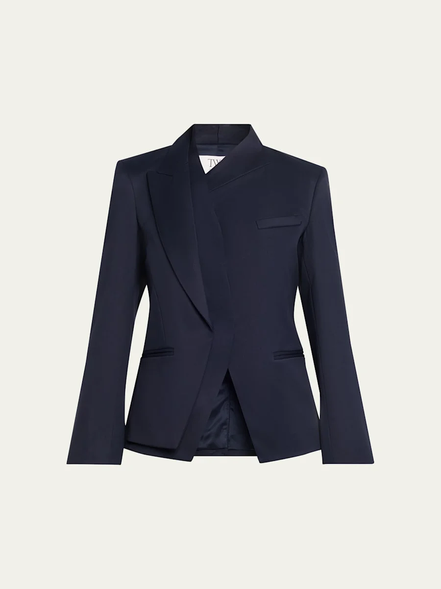 Tailored from stretch viscosewool suiting, TWP's "Micks Wife" asymmetric blazer is designed for a layered effect Approx. 28.3"L from shoulder to hem Asymmetric peak lapel Padded shoulders Long sleeves; button cuffs Single chest welt pocket Hip besom pockets Slim fit Hidden button front Viscose/virgin wool/elastane Made in USA from imported materials SIZE amp; FITModel measurements: 5'10" tall Model is wearing a US size 4/Small