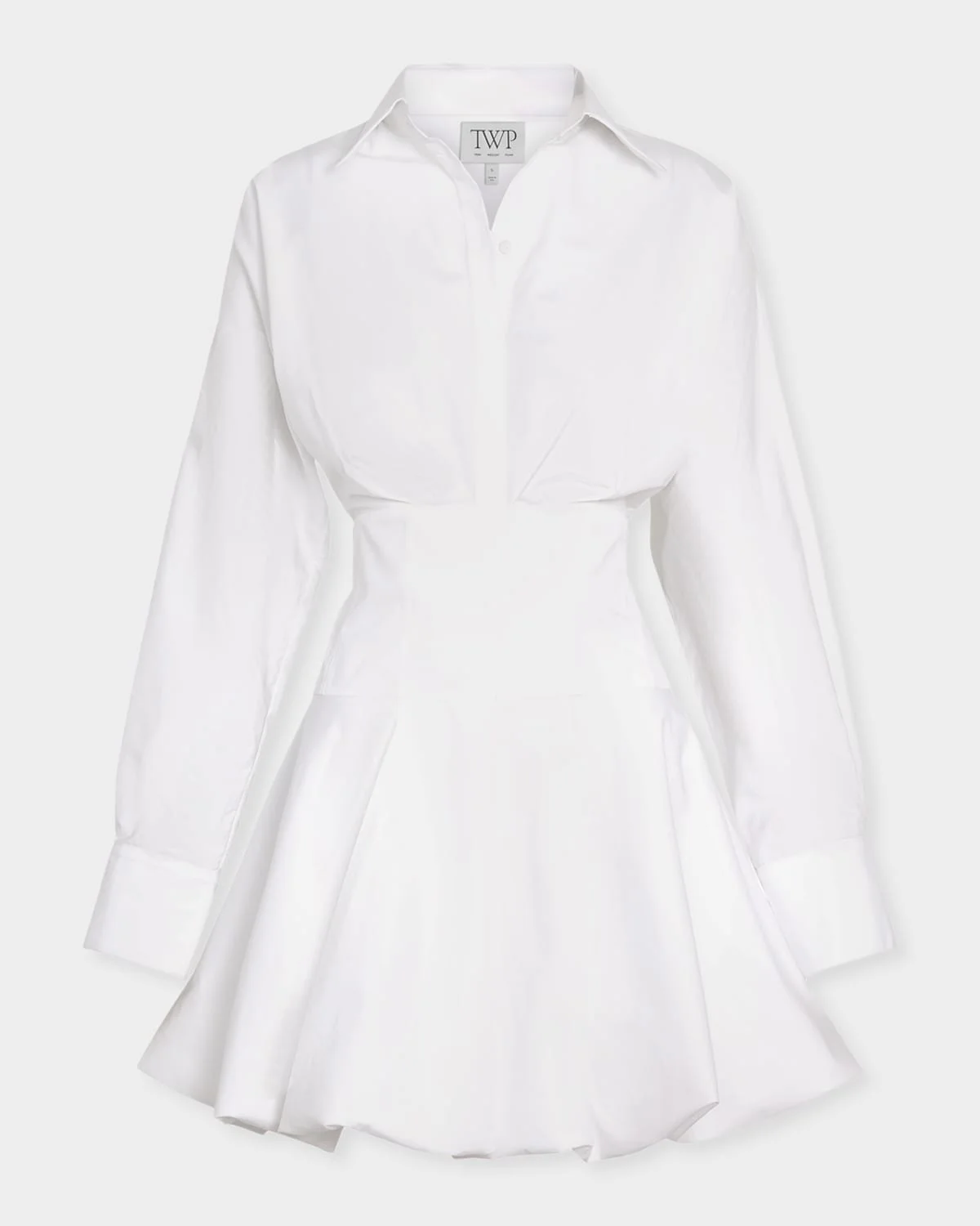 Crafted of cotton poplin, the "Mila" shirtdress by TWP features a voluminous bubble hem Point collar; partial button front Long sleeves; button cuffs Fitted waist Hem falls above the knee Flounced A-line skirt & nbsp; Cotton Dry clean Made in USA SIZE & FITModel measurements: 5 & apos;10" tallModel is wearing a US size 4/Small
