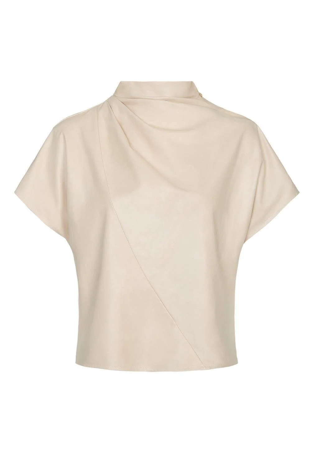 DETAILS AND INSIGHT Twp mock neck tee in bone. Pre-Order Ships By April 21 76% Viscose, 24% Linen Dry Clean Made In Us Style 55554-W185-BON