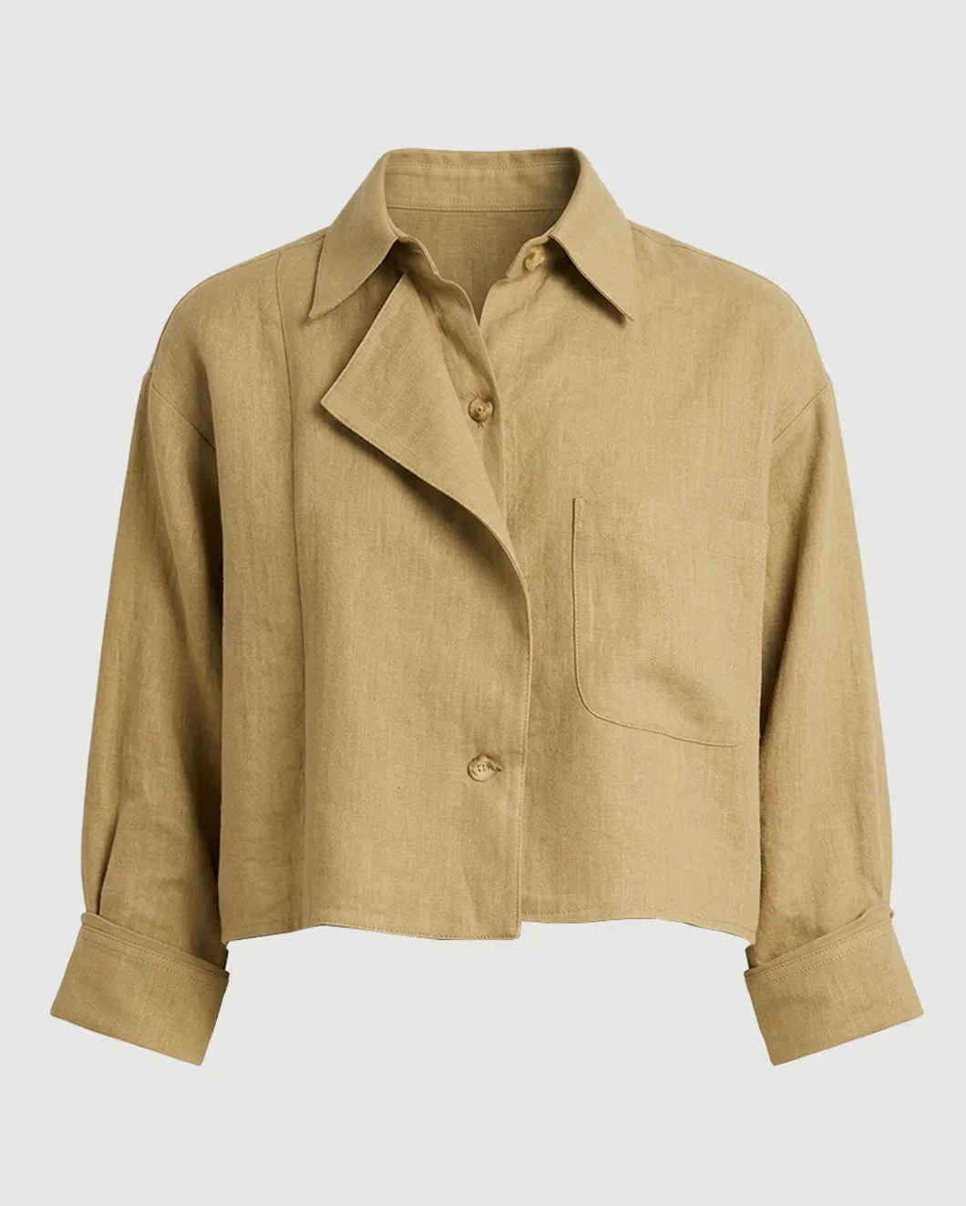 The Next Chapter Top in Washed Linen by TWP is a cropped button-front top featuring a relaxed boxy silhouette, chest patch pocket, a classic point collar, and a signature double roll button cuffs. Perfect for elevated office wear. Model is 5'10" and wearing a size Small. - Material: 100% Linen - Fit: Cropped fit - Style it with: Matching Crosby St Pant