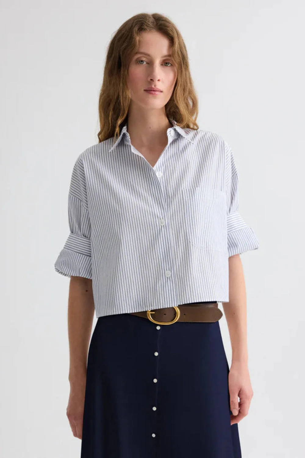 TWP Next Ex White-Midnight TWP’s signature short sleeved button down crafted in micro hairline stripe. The Next Ex is a cropped, boxy silhouette, complete with a chest patch pocket, button up placket, spread collar, and our signature double roll button cuffs. Composition: 100% Cotton Color: White-Midnight Fit: Model is 5'10'' with 32.5'' bust / 34.5'' hips. Wearing size XS/S.