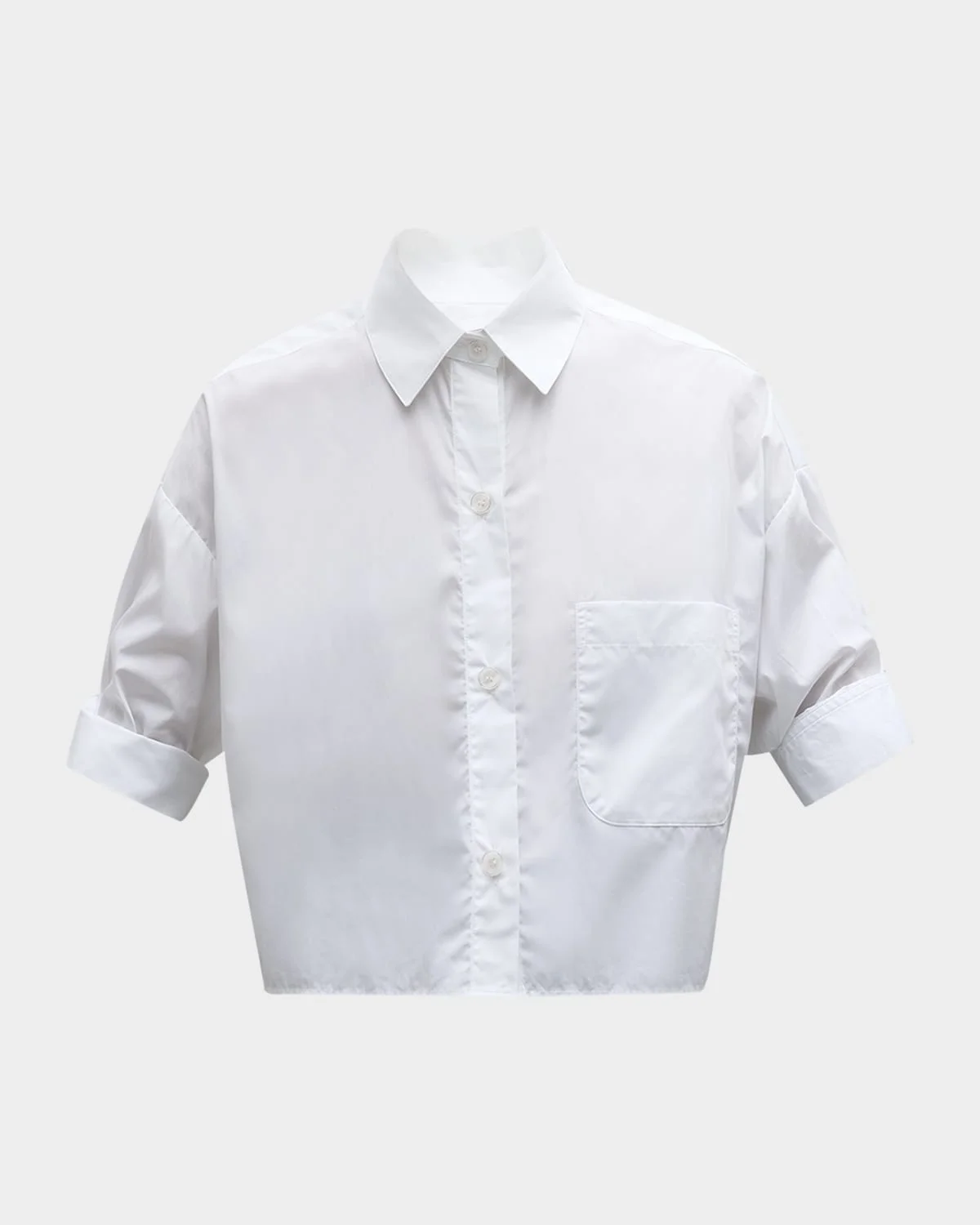 - TWP "Next Ex" shirt features versatile sleeves that can be worn full-length or elbow-length - Point collar; button placket - Long sleeves; button cuffs - Dropped shoulders - Yoked back - Chest patch pocket - Boxy fit - Cropped length - Cotton - Made in USA from imported materials - Model is 5'10"/177cm.
