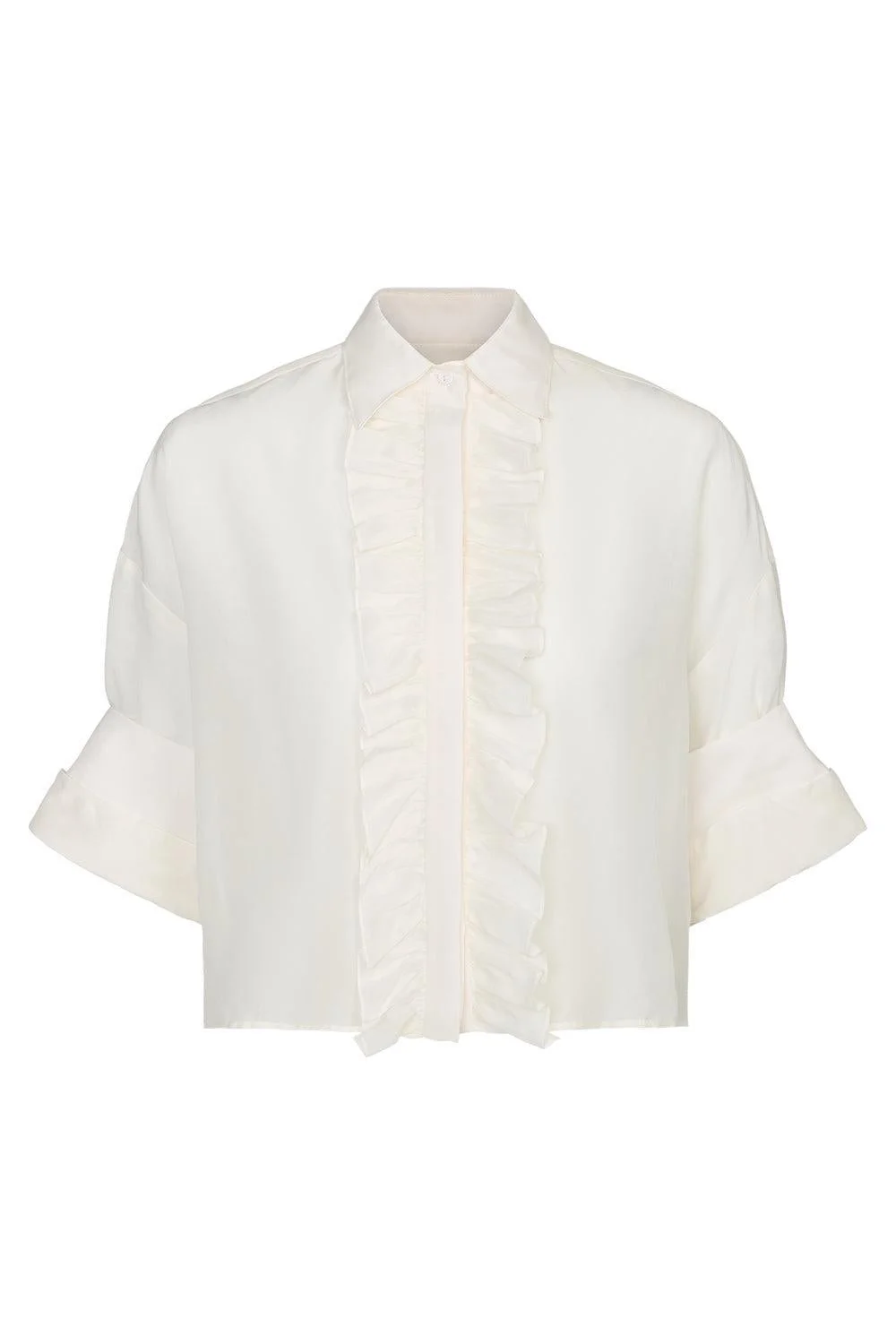 DETAILS AND INSIGHT Twp next ex ruffle shirt in ivory. Pre-Order Ships By April 21 70% Cotton, 30% Silk Dry Clean Made In China Style 55521-W596-WHT
