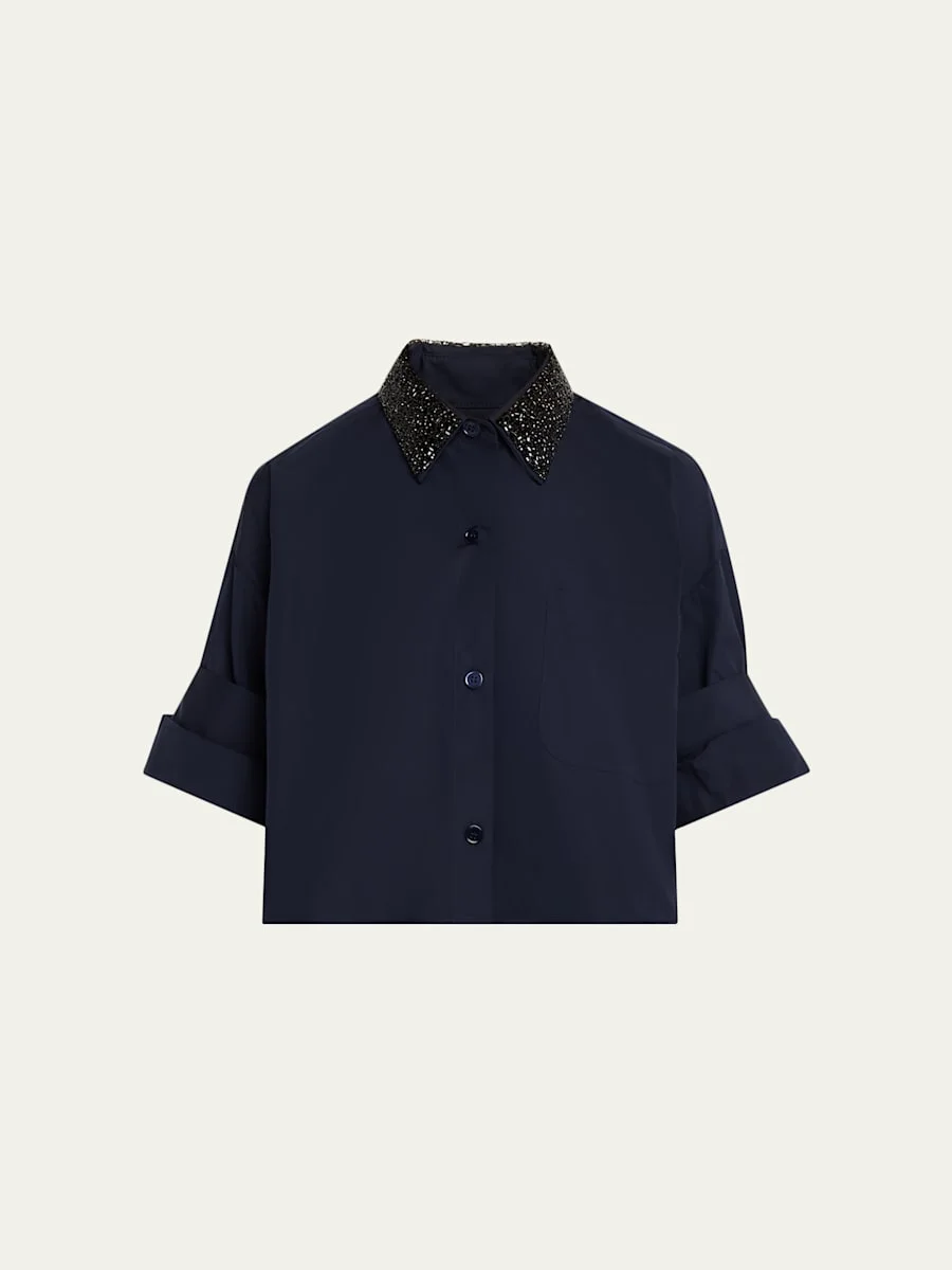 TWP "Next Ex" shirt features versatile sleeves that can be worn fulllength or elbowlength Crystalembellished point collar; button placket Long sleeves; button cuffs Dropped shoulders Yoked back Chest patch pocket Boxy fit Cropped length Cotton Dry clean Made in USA