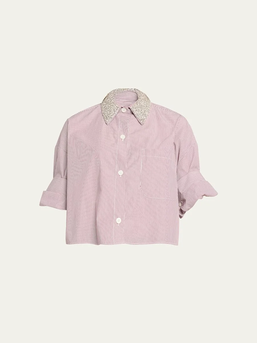 TWP "Next Ex" striped shirt features versatile sleeves that can be worn fulllength or elbowlength Approx. 20.5"L from shoulder to hem Crystalembellished point collar; button placket Long sleeves; button cuffs Dropped shoulders Yoked back Chest patch pocket Boxy fit Cropped length Cotton Dry clean Made in USA from imported materials
