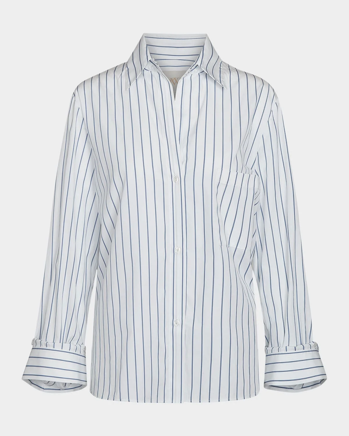 Endlessly versatile, the "Next Morning" shirt by TWP features a classic striped pattern Approx. 26.6"L from shoulder to hem Spread collar Long sleeves; button cuffs Single chest patch pocket Yoked back Hip length Relaxed fit Button front closure Cotton Dry clean Made in Italy