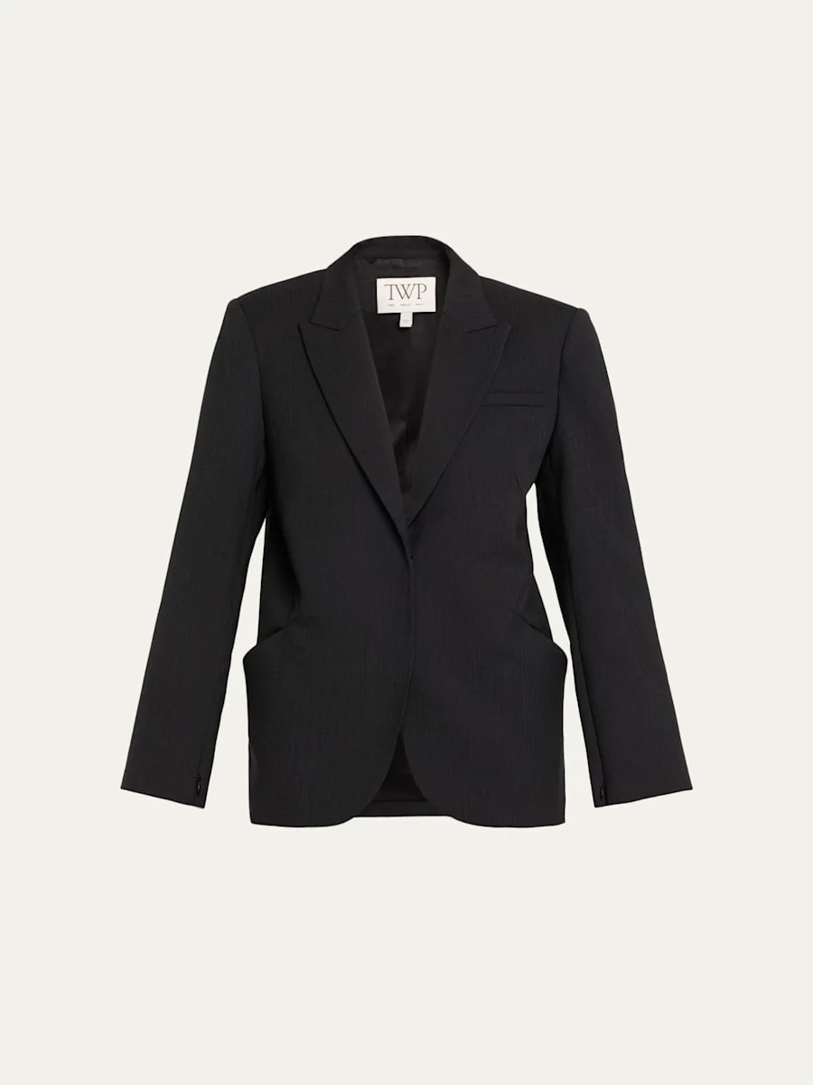 TWP "Perfect Boyfriend" blazer jacket is crafted from micro herringbone weave, tailored with a boxy silhouette and molded padded shoulders Peak lapels; singlebreasted front Long sleeves; button cuffs Padded shoulders Hip split pockets Boxy, straight fit Hip length Wool/elastane Made in USA from imported materials