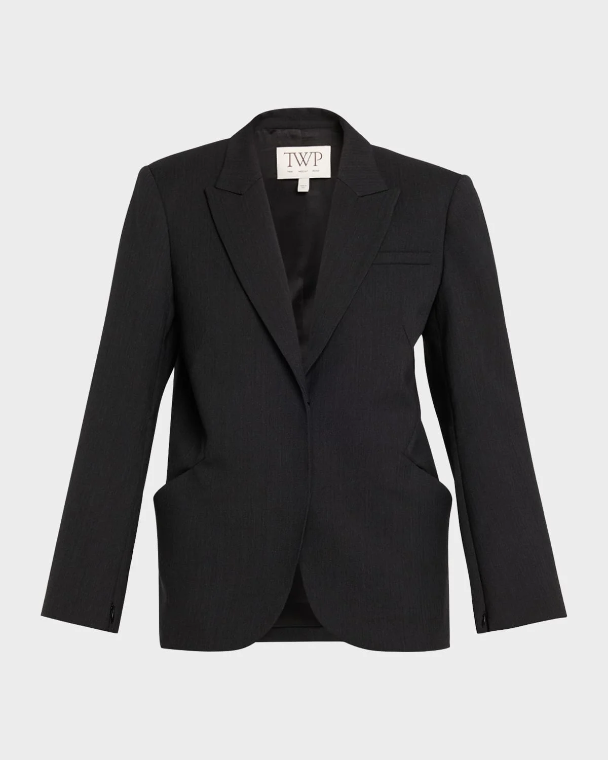 TWP "Perfect Boyfriend" blazer jacket is crafted from & nbsp;micro herringbone weave, tailored with a boxy silhouette and molded padded shoulders Peak lapels; single-breasted & nbsp;front Long sleeves; button cuffs Padded shoulders Hip split pockets Boxy, straight fit Hip length Wool/elastane Made in USA from imported materials