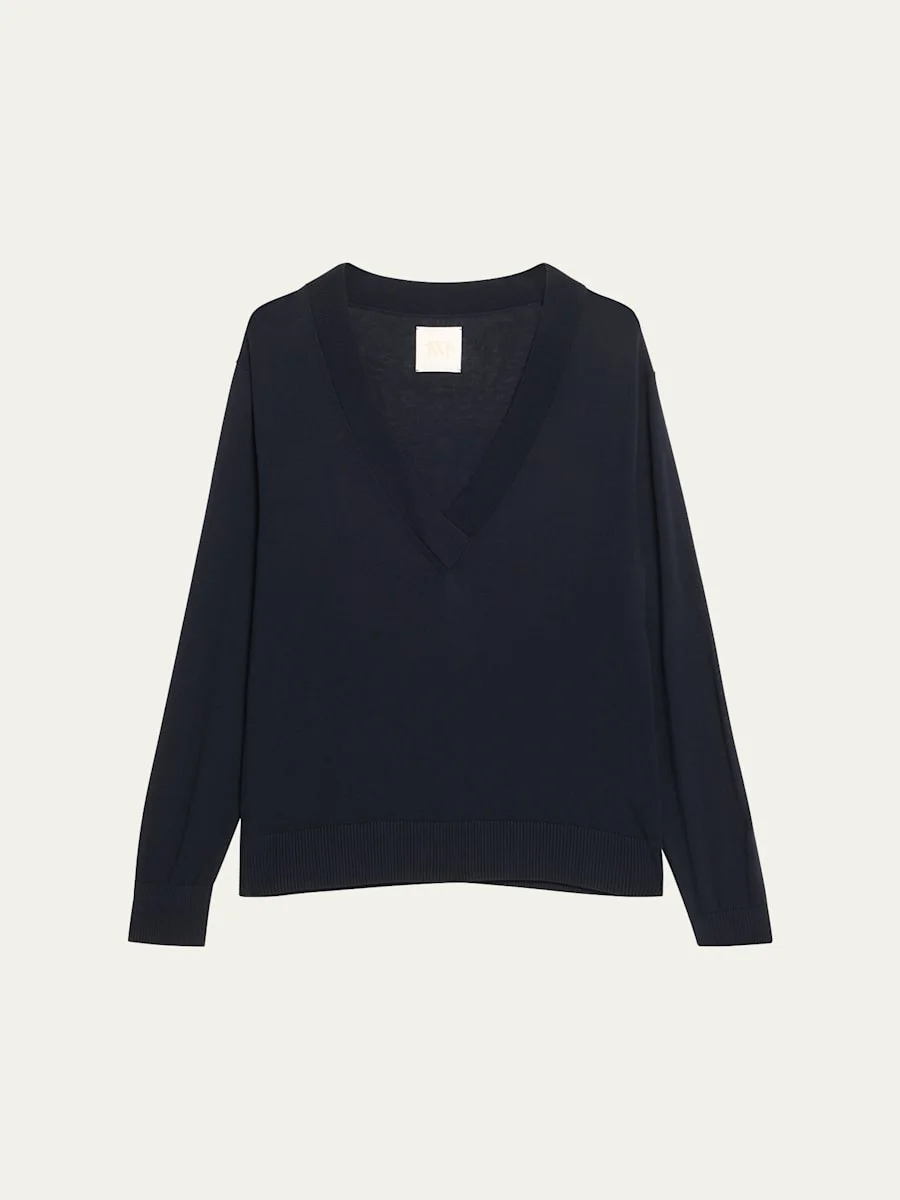 Knit from pure wool, this sweater by TWP offers the perfect flattering deep V silhouette Approx. 24.3"L from shoulder to hem V neckline Long sleeves Classic fit Hip length Pullover style Wool Dry clean Made in USA from imported materials Online Inquiries: BGS21_T6LQB| Store Inquiries: #5008712