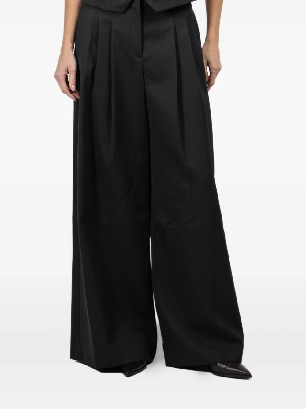 pleated side-pocket palazzo trousers Highlights - Black - Pleated front - Wide leg - High waist - Straight hem - Concealed zip fly Imported Composition Wool 100% Washing instructions Dry Clean Only