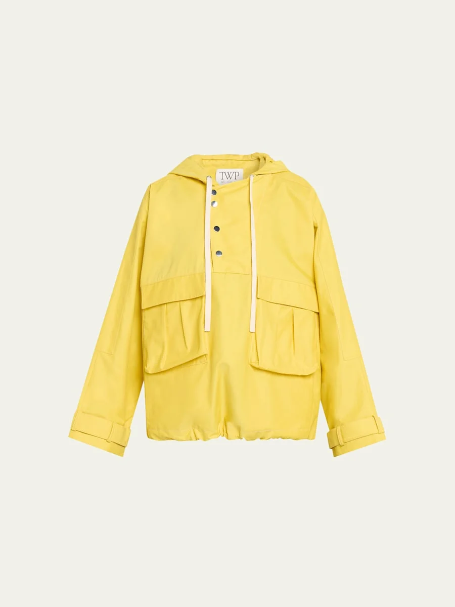 Designed in waterrepellent twill, the "Rain Check" jacket by TWP is finished with a smooth, structured hand Hooded neckline; adjustable drawcods Long sleeves with belted cuffs Oversized patch pockets Relaxed fit Slightly cropped silhouette Partial snap front placket Pullover style Cotton/nylon/polyamide/polyurethane Dry clean Made in USA SIZE amp; FITModel measurements: 5'10" tall Model is wearing a US size 4/Small