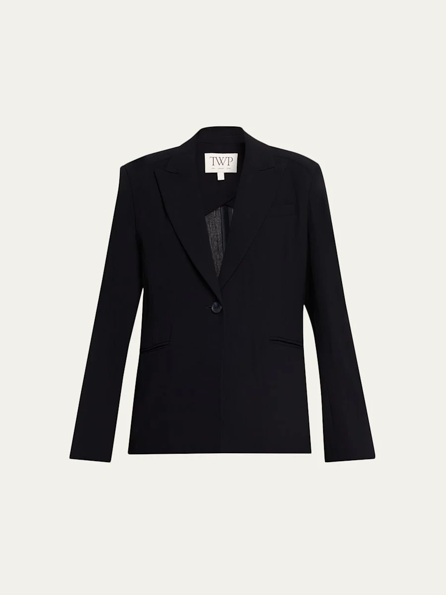 TWP boy blazer is crafted of drapey wool crepe Peak lapels; singlebreasted front Long sleeves; button cuffs Chest welt pocket Hip doble welt pockets Oversized fit Hip length One button closure Wool Made in USA from imported materials