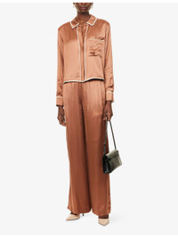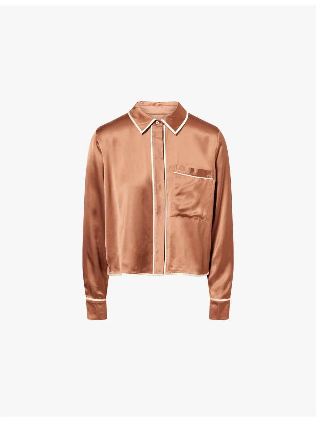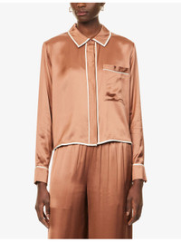 PRODUCT DETAILS - TWP woven pyjama top - 100% viscose; contrast 100% viscose - Concealed button fastenings at front - Spread collar - Buttoned cuffs - Relaxed fit, collar, long sleeves, patch pocket at front, straight yoke and pleat at back, contrast piping, all-over satin texture - Dry clean only - True to size - Model is 5ft 10in/1.78m and wears a size small - Lightweight, slight stretch Ref: R04517755