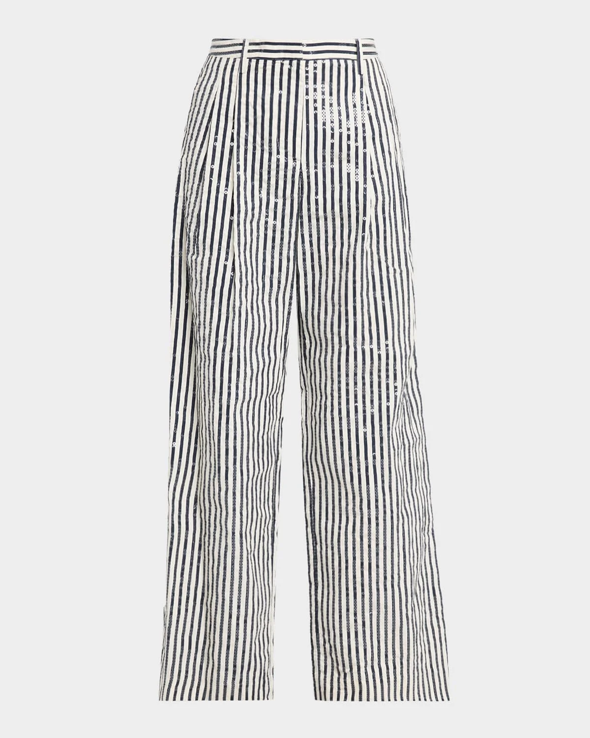 Crafted from superfine Italian cotton embellished with clear sequins, the "Sulli" trousers by TWP are complete with front pleats for added volume Mid rise Side pockets Full length Wide legs Hookandeye/zip fly; belt loops Cotton/nylon/polyamide Dry clean Made in USA